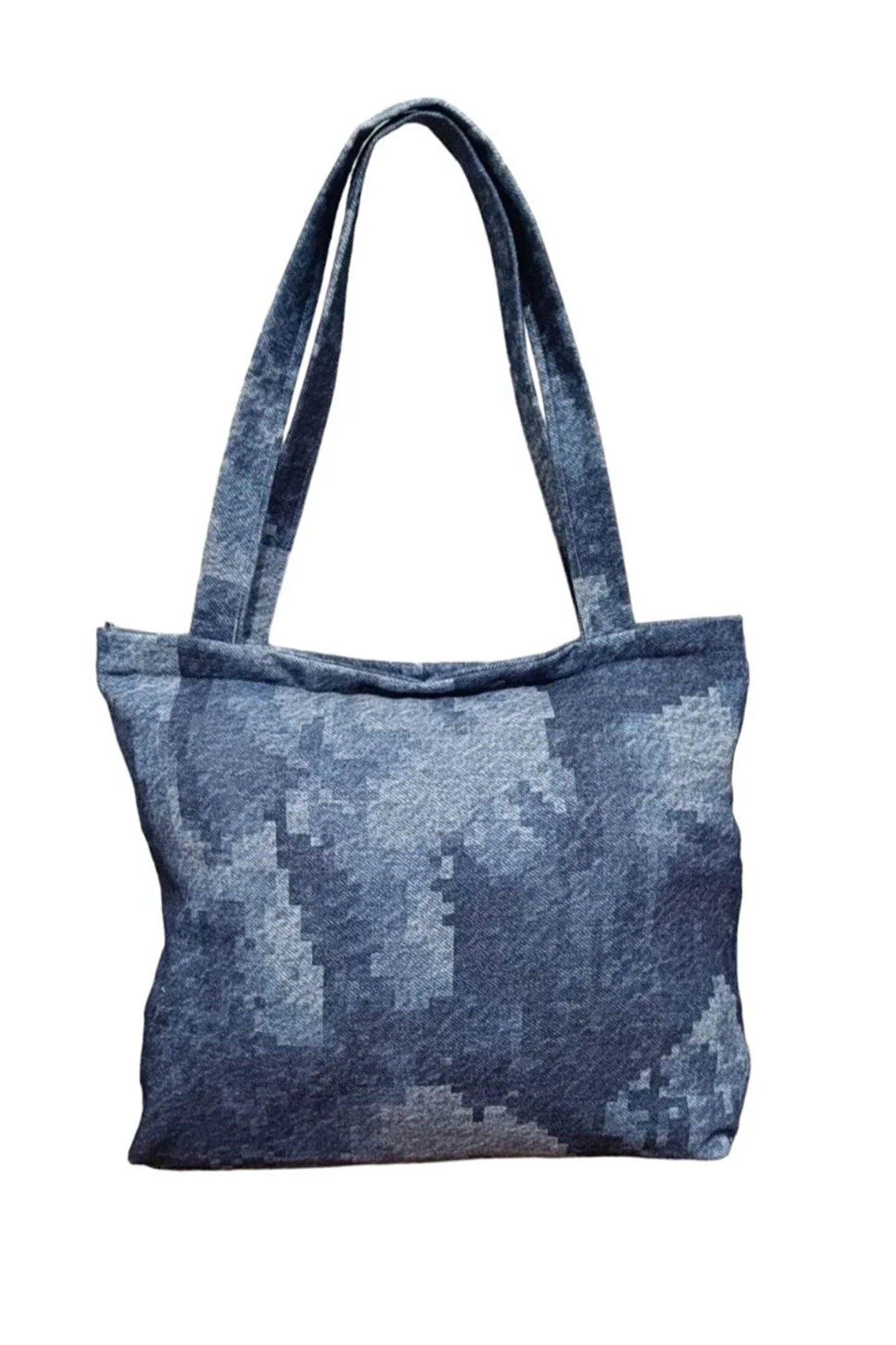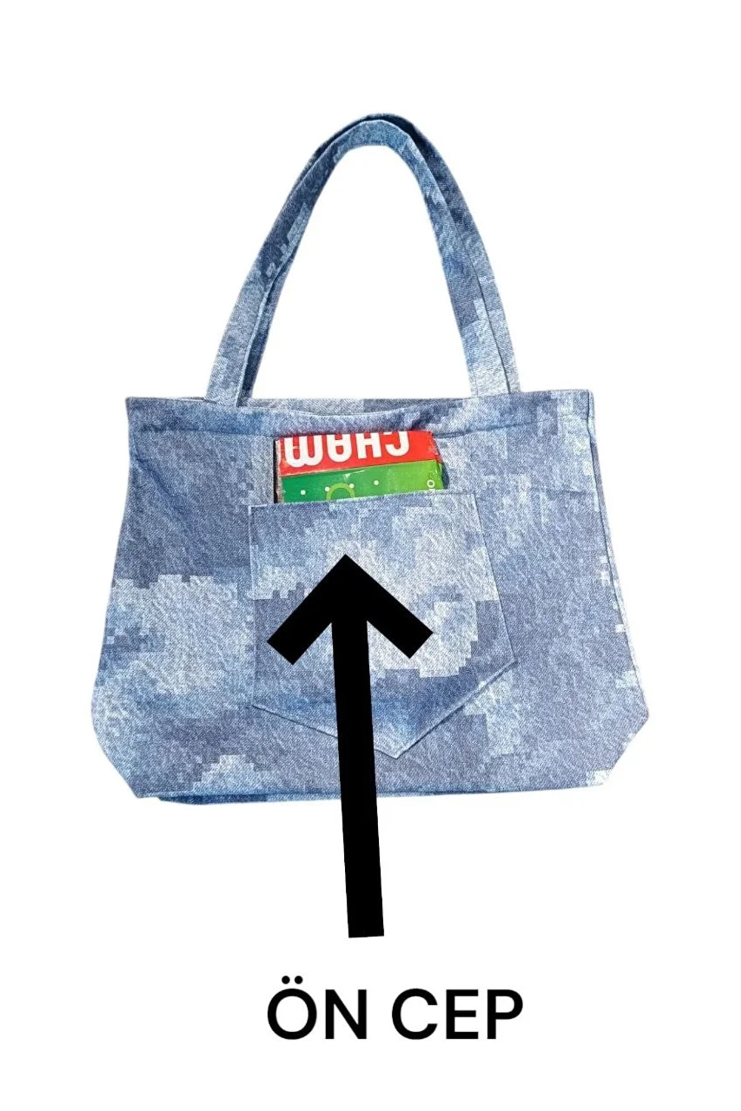 Desenli Bez Tote Bag Çanta Cepli ve Fermuarlı