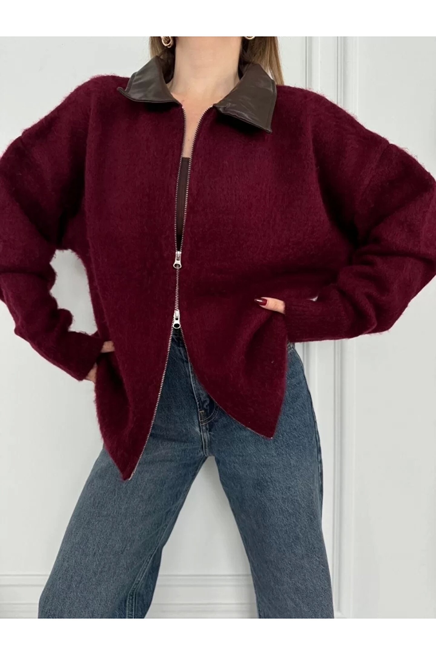 MODA Deri Yakalı Pamuk dokulu Çift Taraflı Çalışan Fermuar Ceket - Bordo