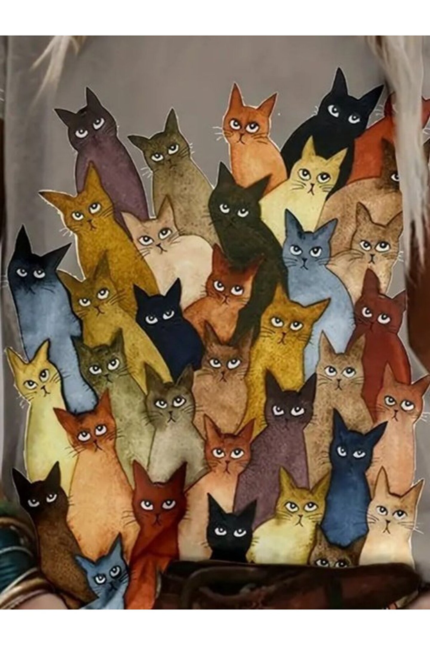 Kadın Kısa Kollu Bisiklet Yaka Kedi Desenli Süprem Bluz