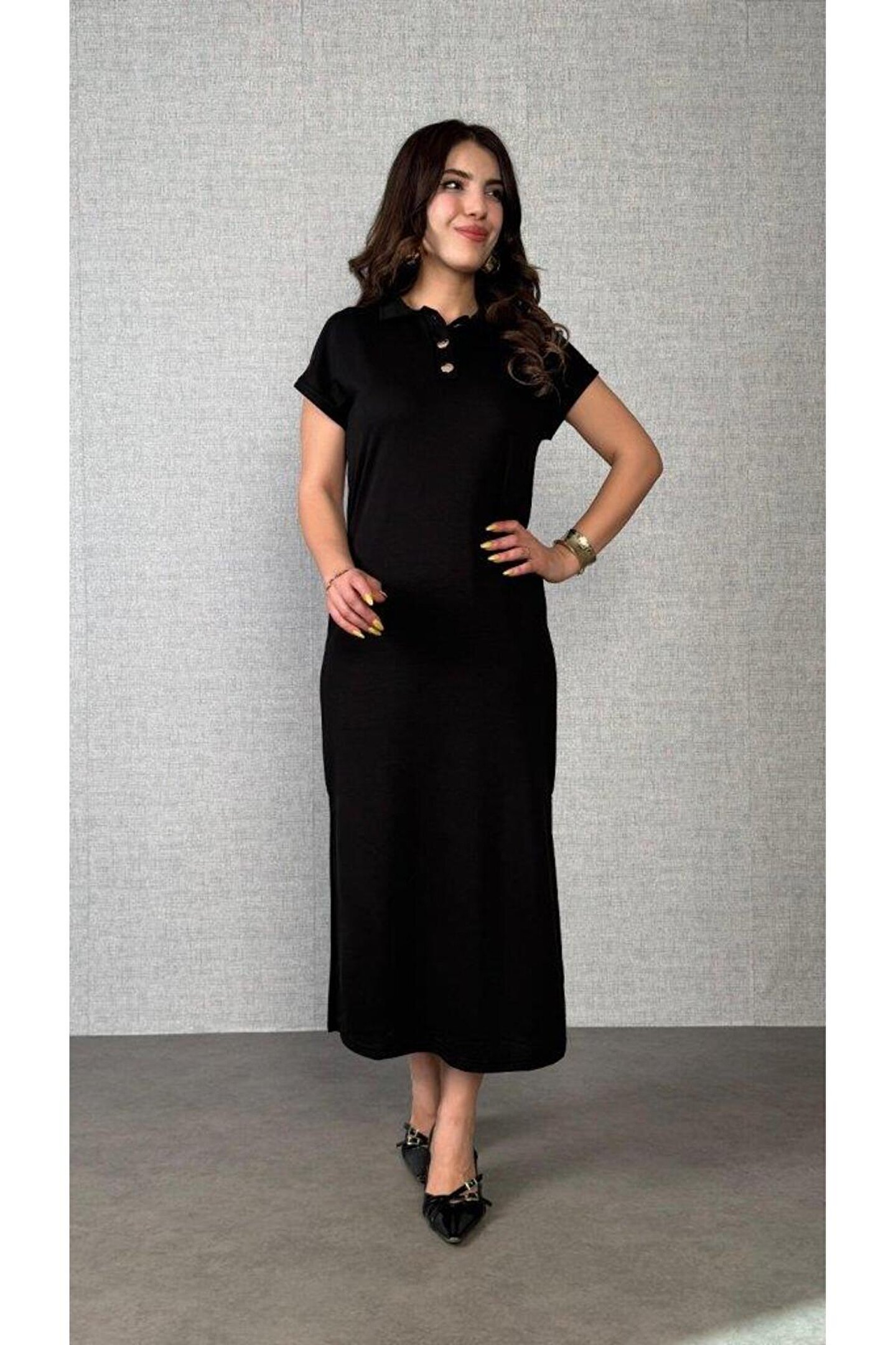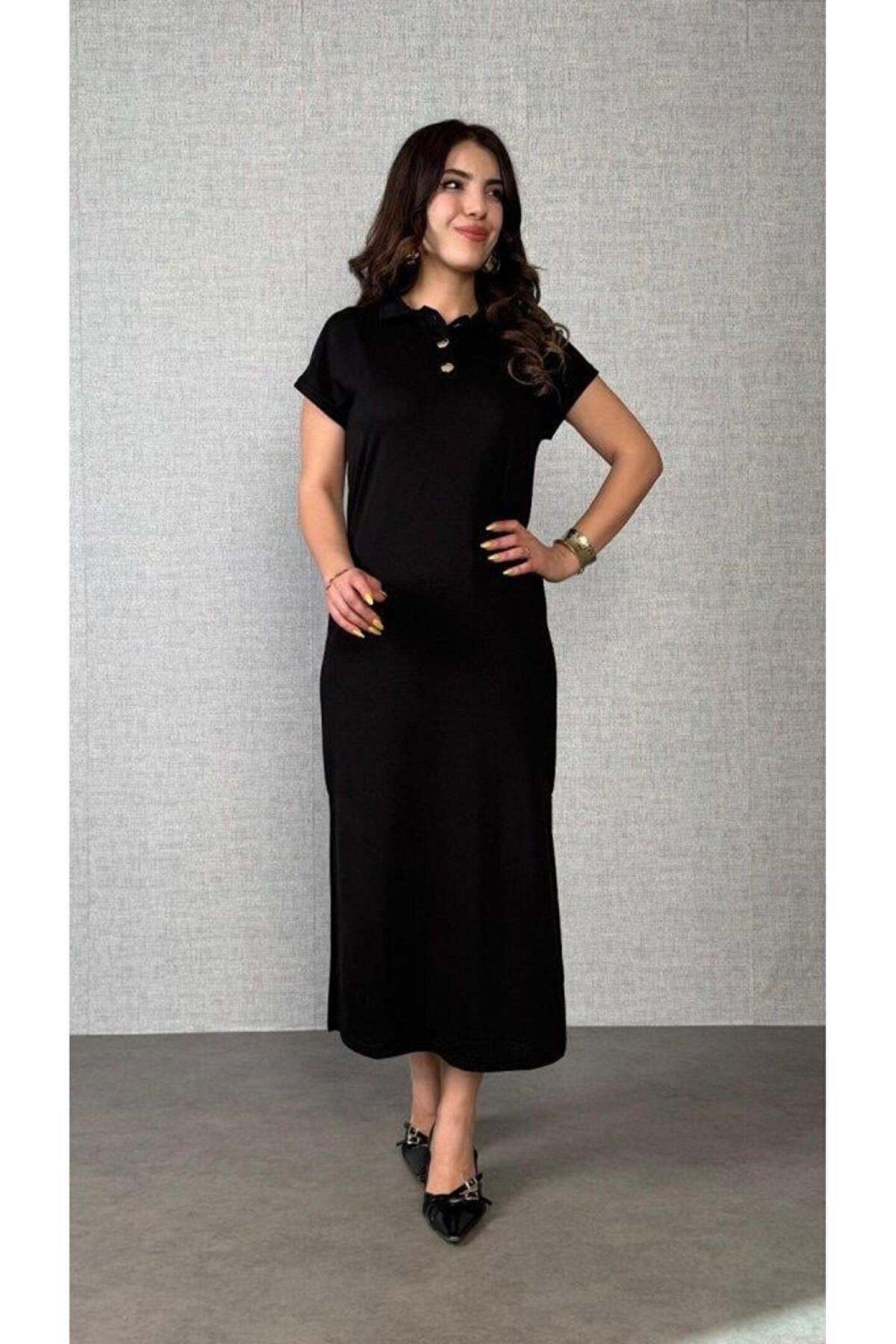Kadın Kısa Kollu Yakalı Yandan Yırtmaçlı Viskon Iki Iplik Elbise