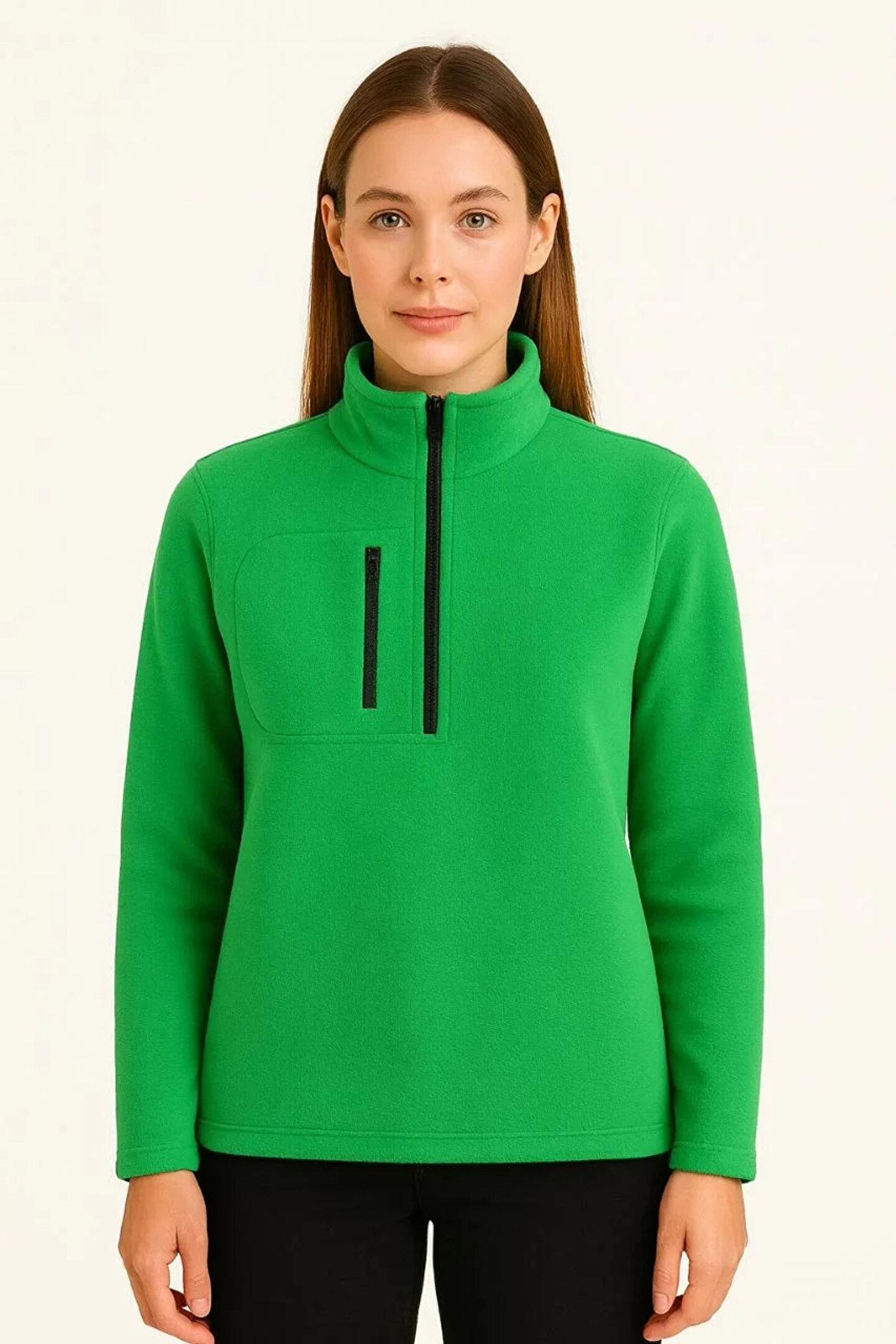 Polar Kazak – Dik Yaka, Yarım Fermuarlı, Fermuarlı Göğüs Cepli, Siyah Biyeli, Kışlık Rahat Regular Fit Günlük Model - Yeşil