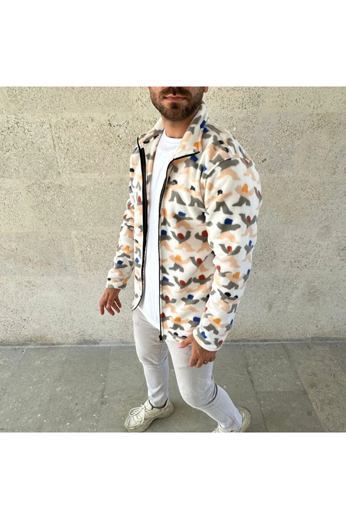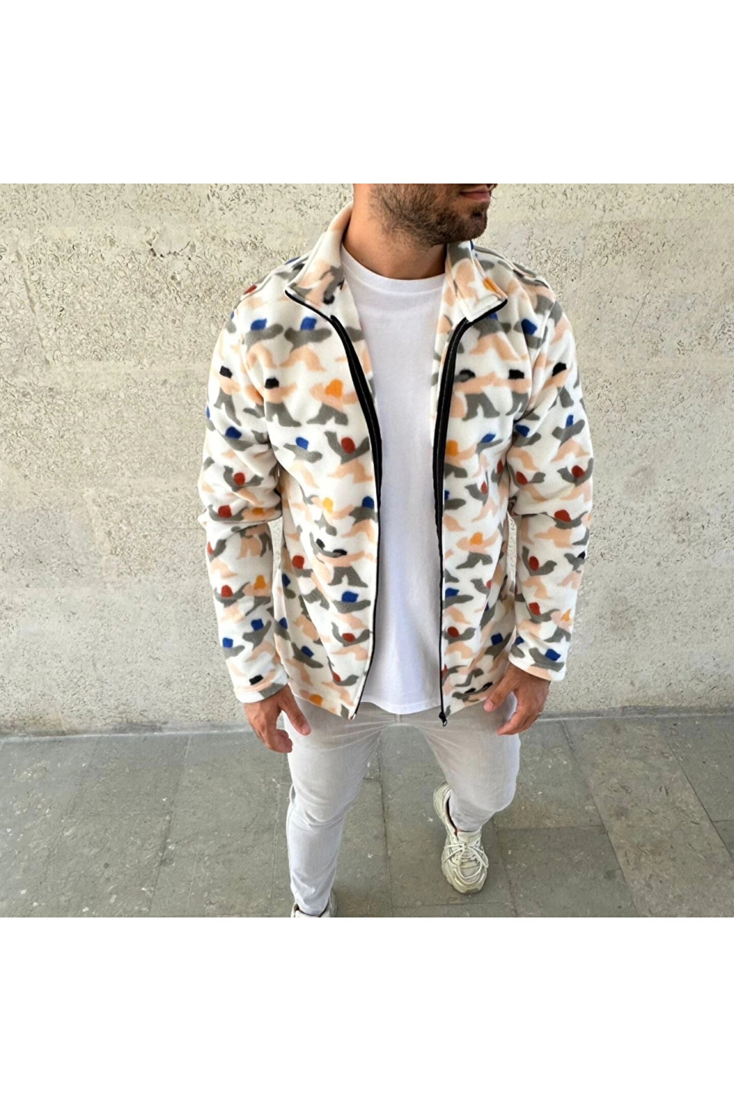 MODA Erkek Tam Fermuarlı Desenli Polar Sweat – Siyah Multicolor Figür Desen Yakalı, Uzun Kollu, Oversize