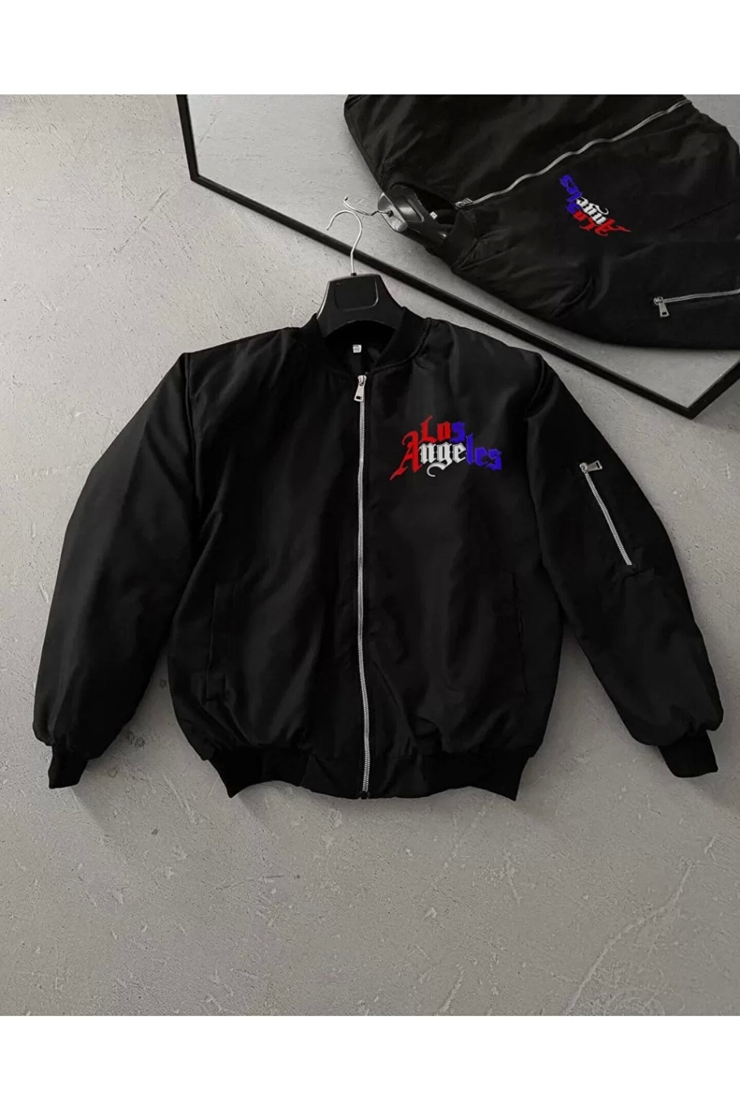 Tam Fermuarlı Uzun Kol Baskılı Bomber Ceket - Siyah
