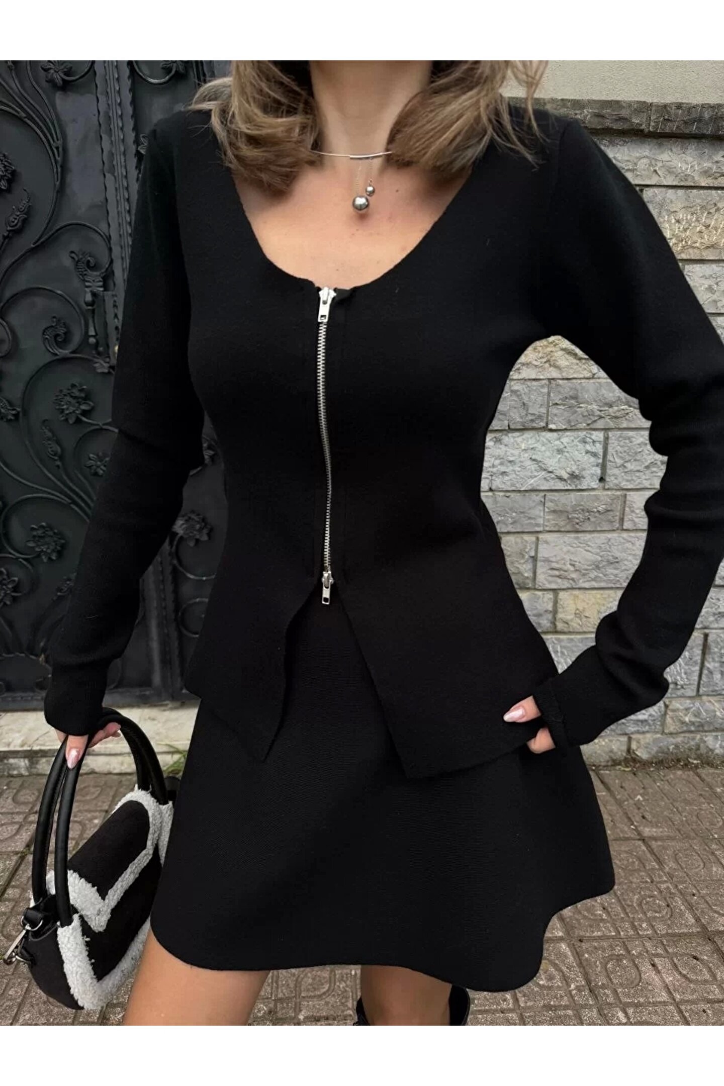 Bu kadın üst, bahar ve kış sezonlarına uygun olarak tasarlanmıştır.; Uzun kollu ve çift taraflı fermuarlı olan üst, açık yaka tasarımıyla şıklık sunarken, mini boyu ile modern bir görünüm elde edilmiştir.; Tam kalıp yapısı, vücuda oturan zarif bir siluet oluşturur.