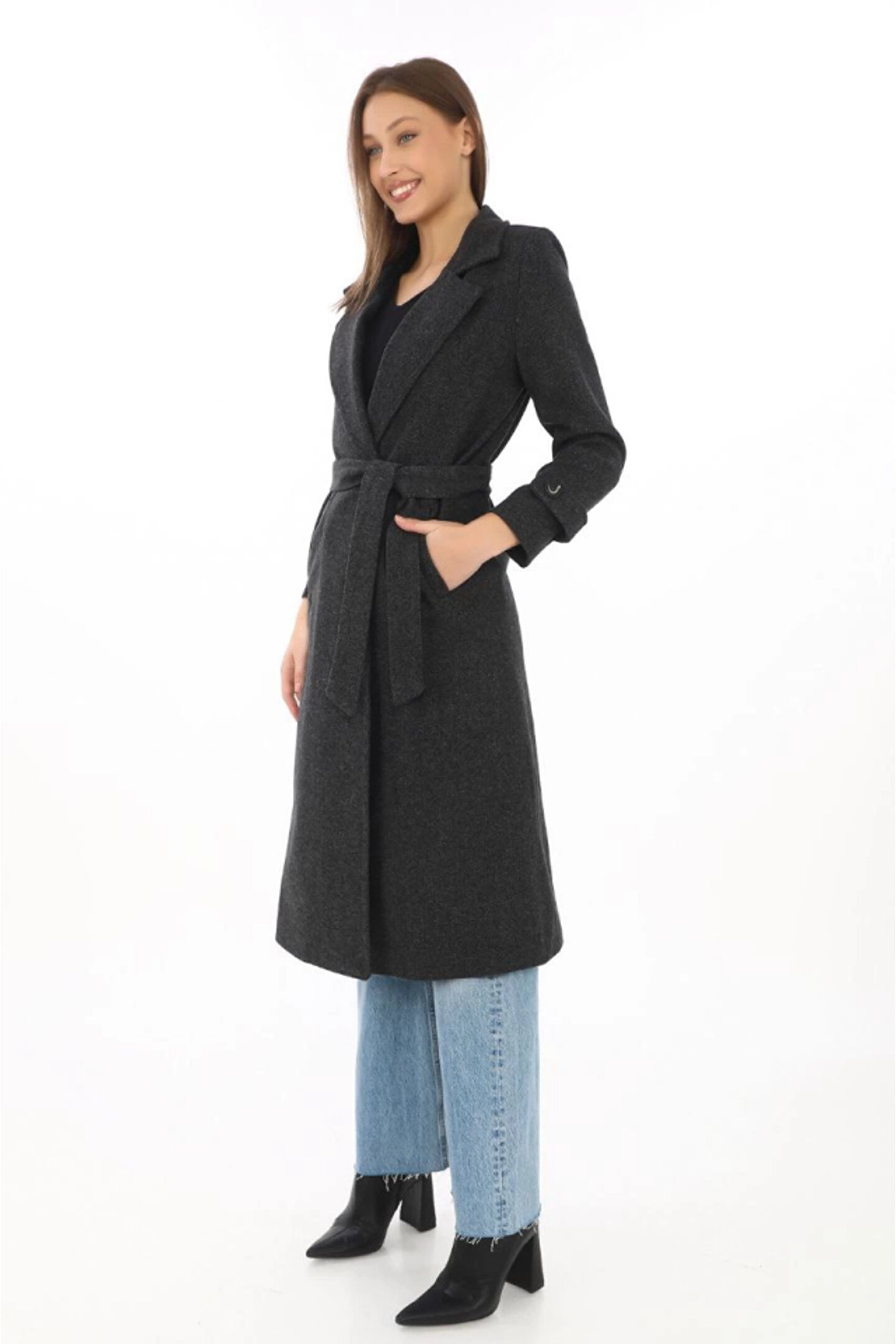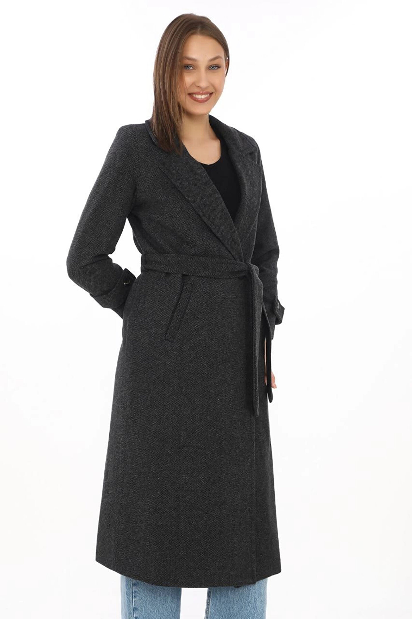 MODA Kadın Balık Sırtı Kaşe Kaban – Uzun Boy Kruvaze Yaka Kuşaklı Astarlı Kışlık Tesettür Kaban, Yünlü Do