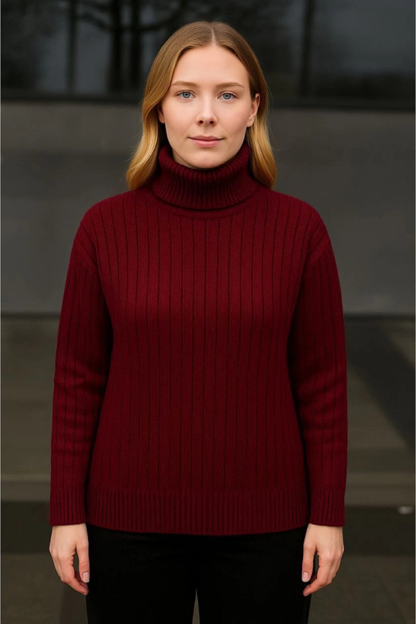 MODA Kadın Balıkcı Yaka Bağazlı Triko Kazak Pamuklu Kalın Fitilli Dokuma - Bordo
