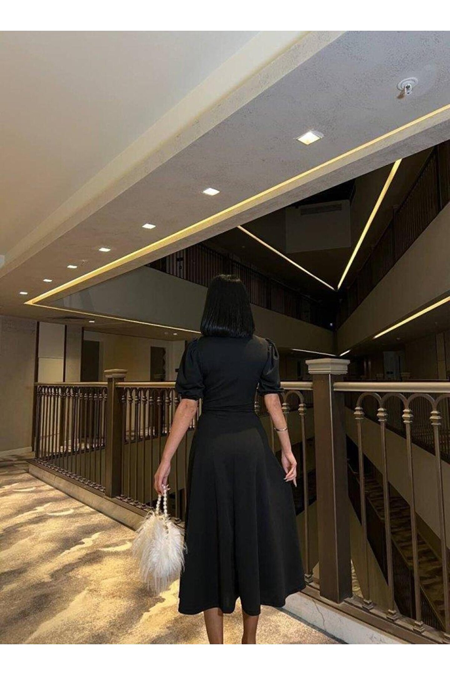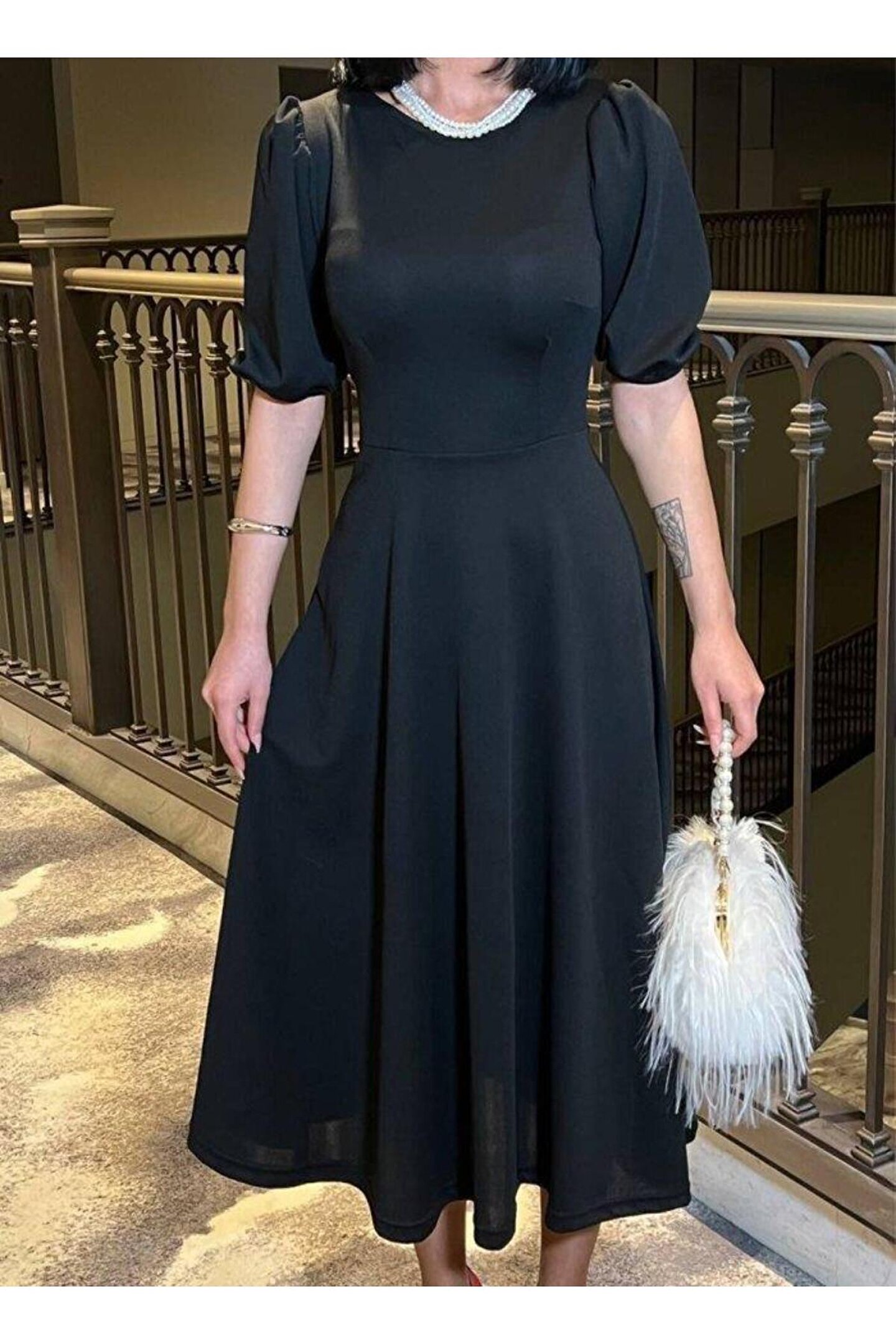 MODA Kadın Bisiklet Yaka Kısa Kol Lastik Detay Uzun Elbise