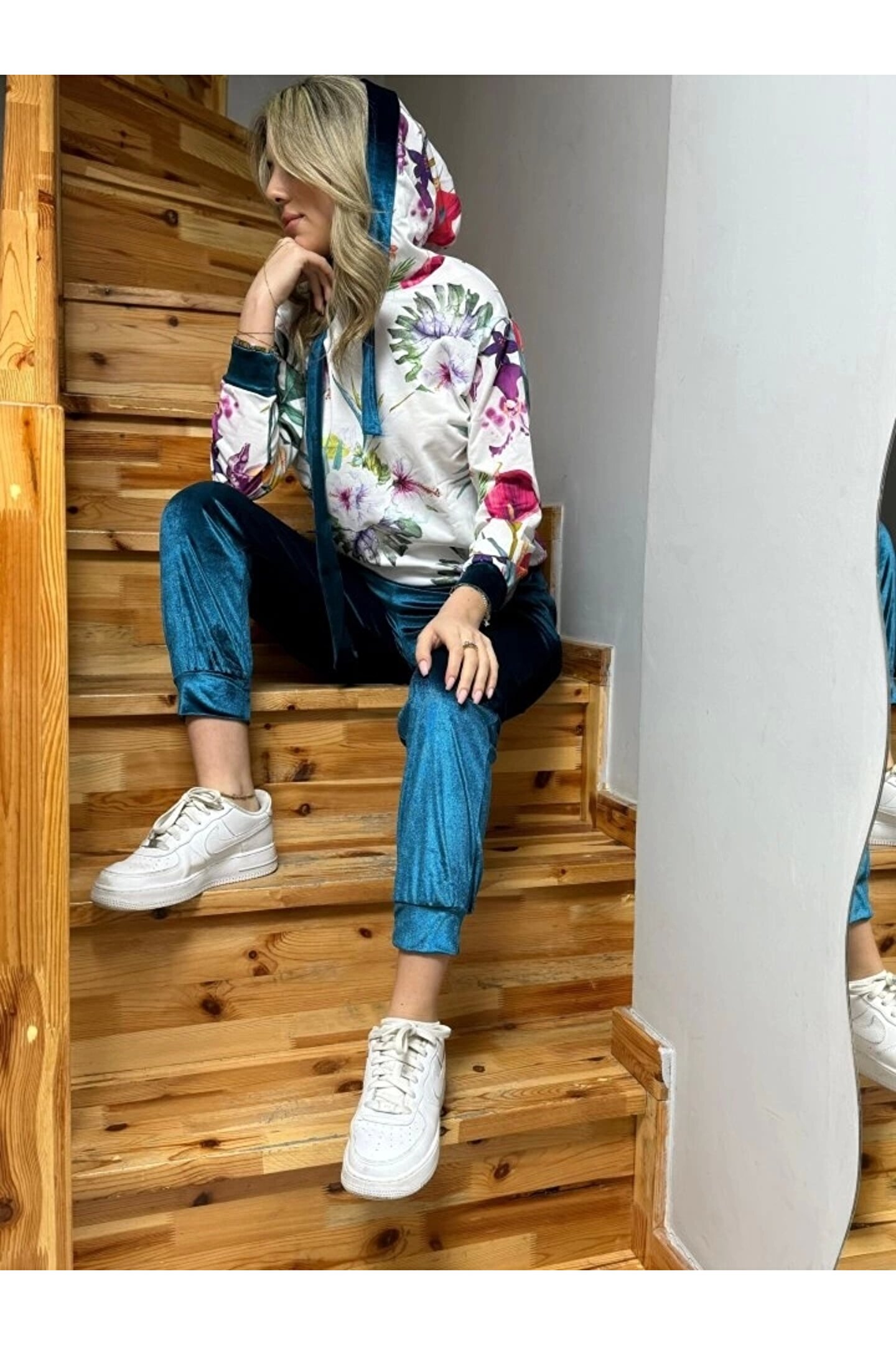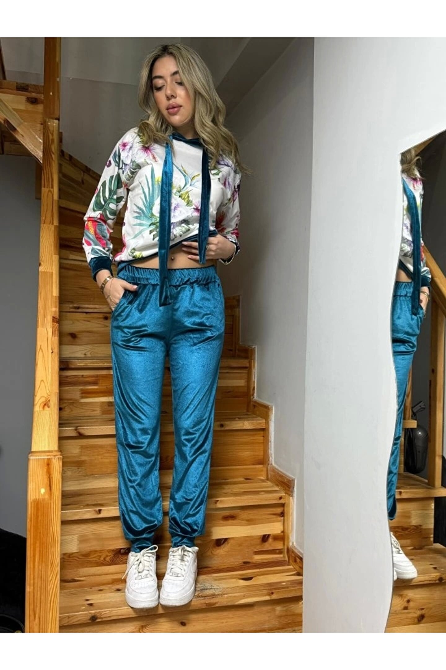 MODA Kadın Kadife Kumaş Uzun Kollu Kapüşon Detay çiçek Baskılı Sweat Ve Pantolon Ikili Takım