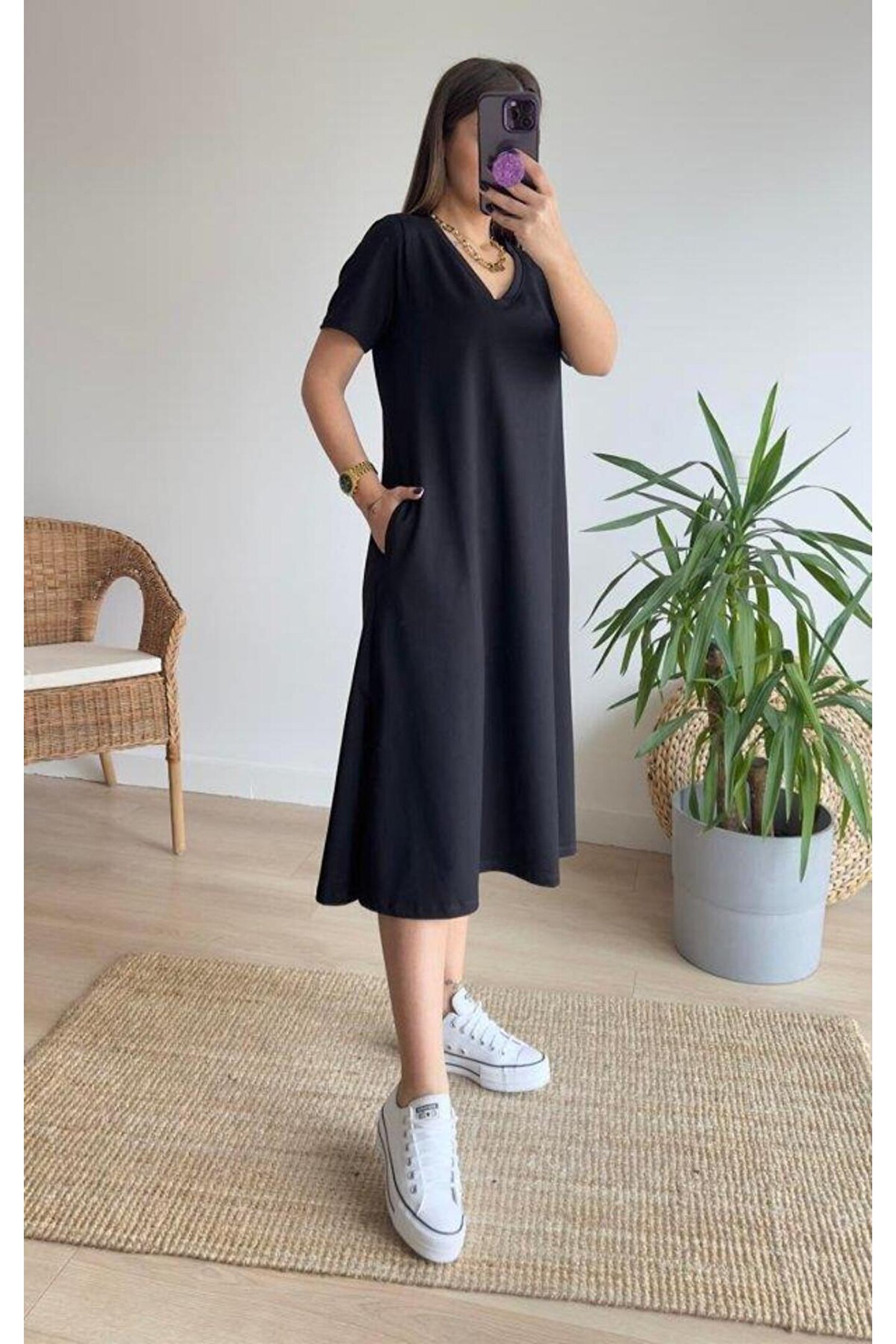 MODA Kadın Kısa Kollu V Yaka Cepli A Kesim Detaylı Viskon Elbise