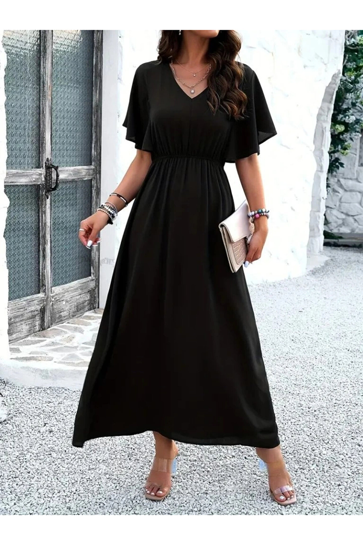 Kadın Kısa Kollu V Yakalı Beli Lastikli Uzun Viskon Elbise