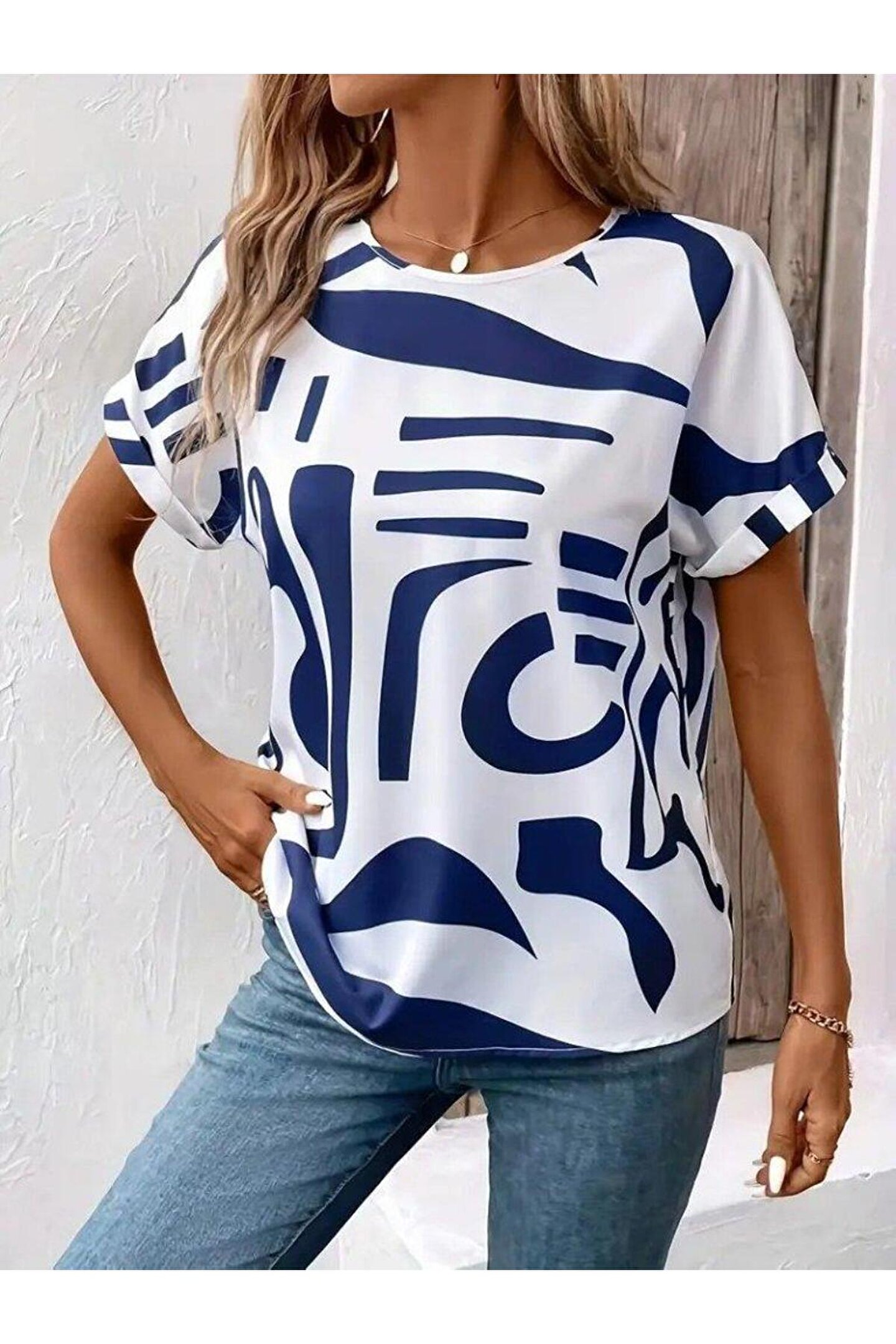 MODA Kadın Kısa Kollu Yuvarlak Yaka Desenli Süprem Bluz