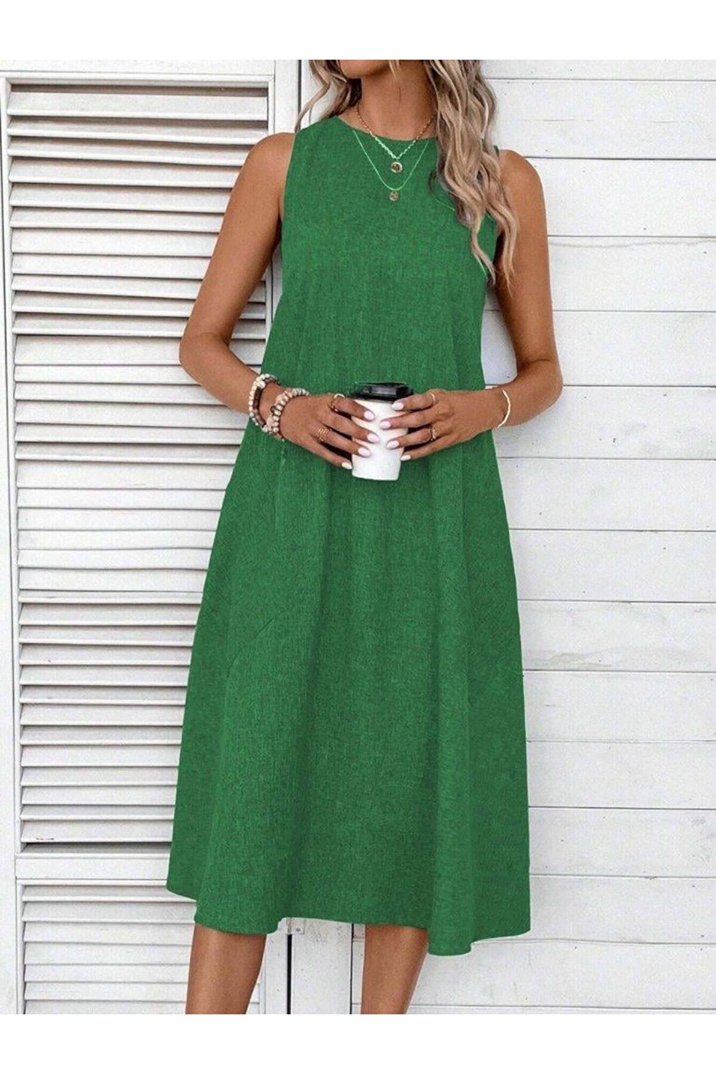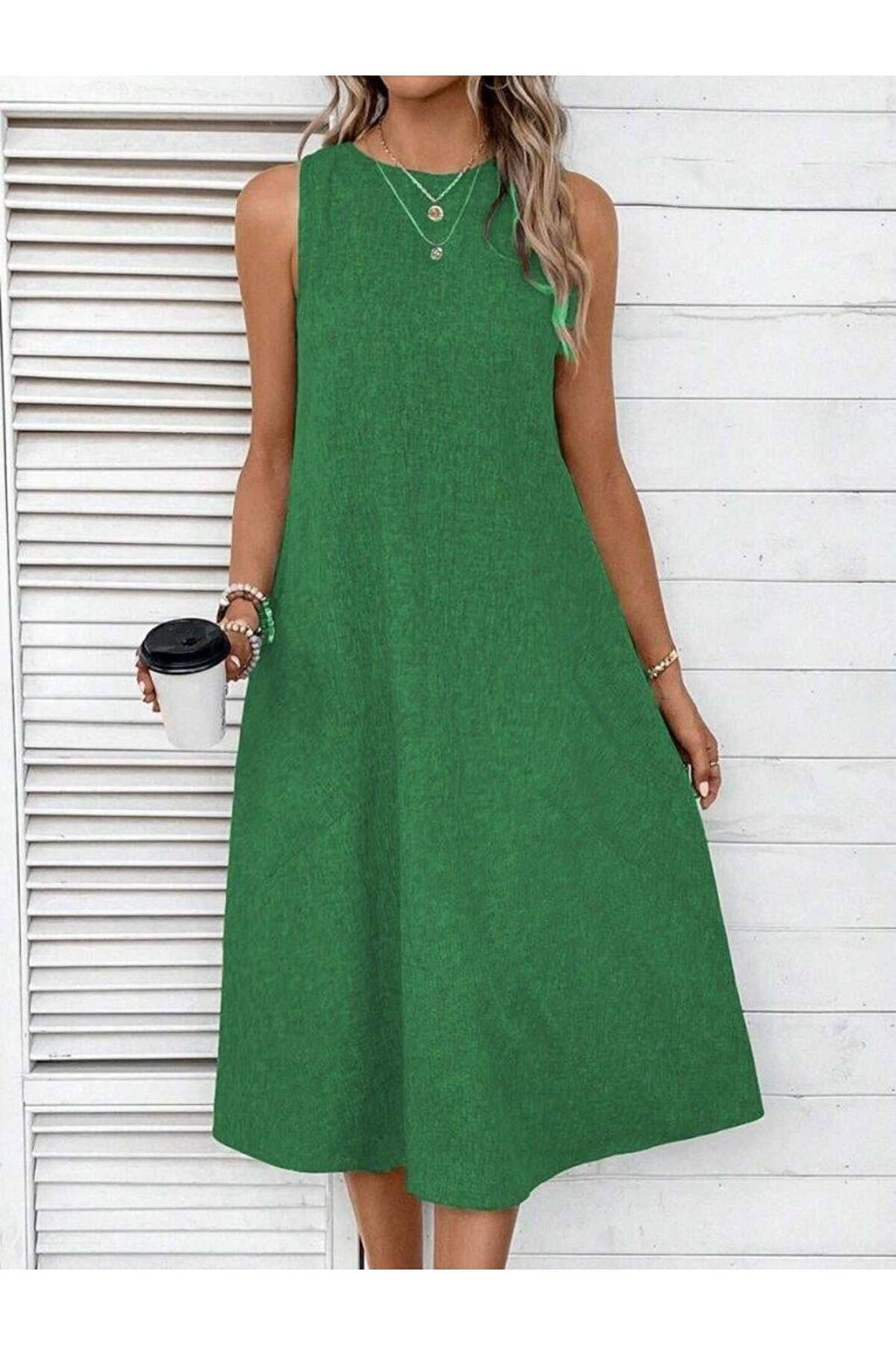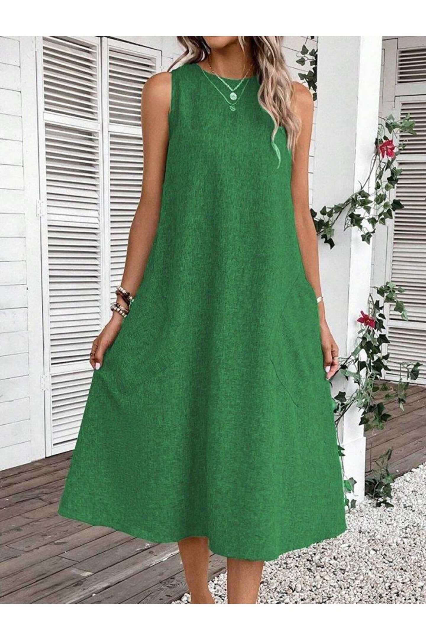 Kadın Kolsuz Bisiklet Yaka Cepli Midi Keten Elbise