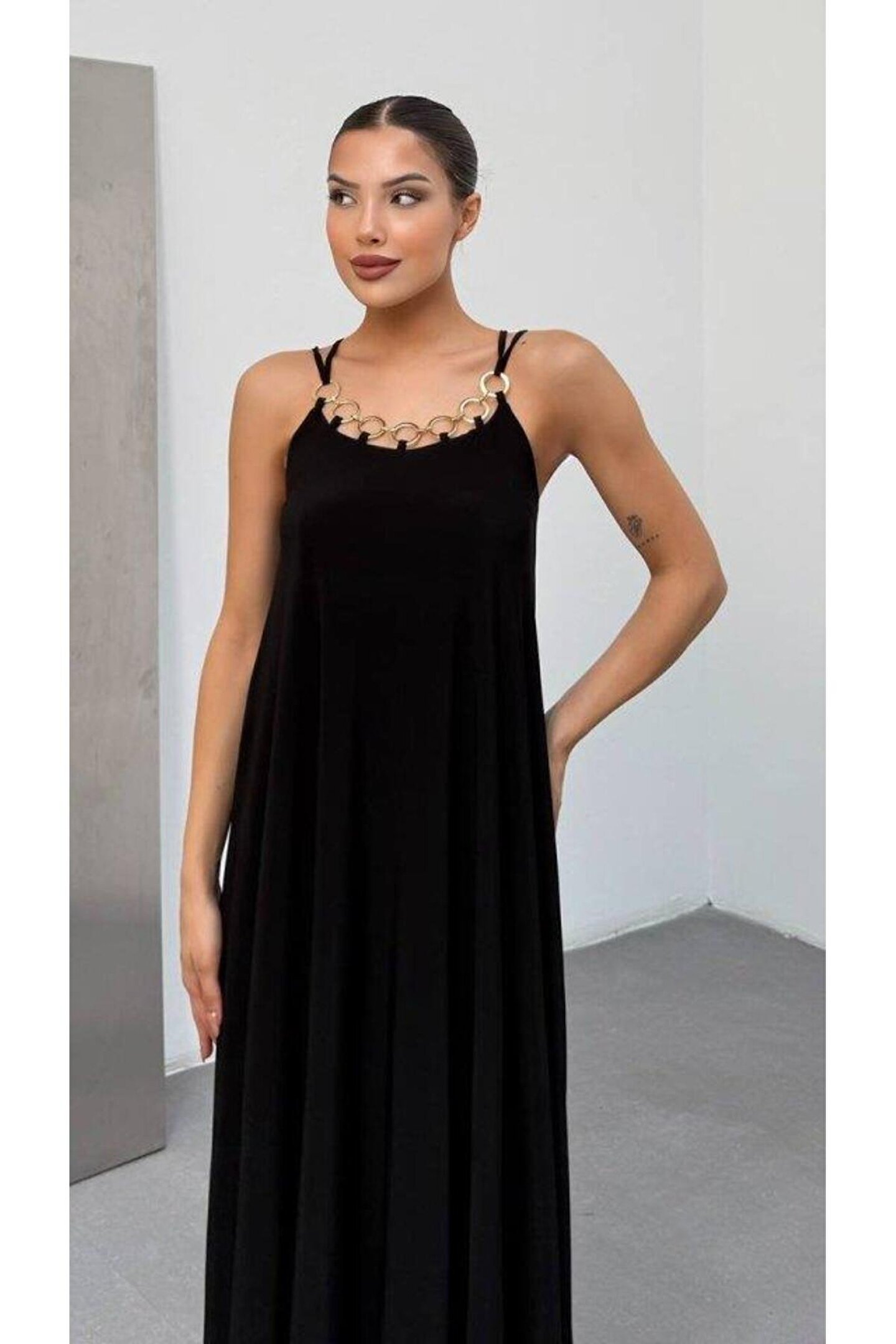 Kadın Omuz Askılı Kuş Gözü Zincir Detay Sandy Kumaş Maxi Boy Elbise