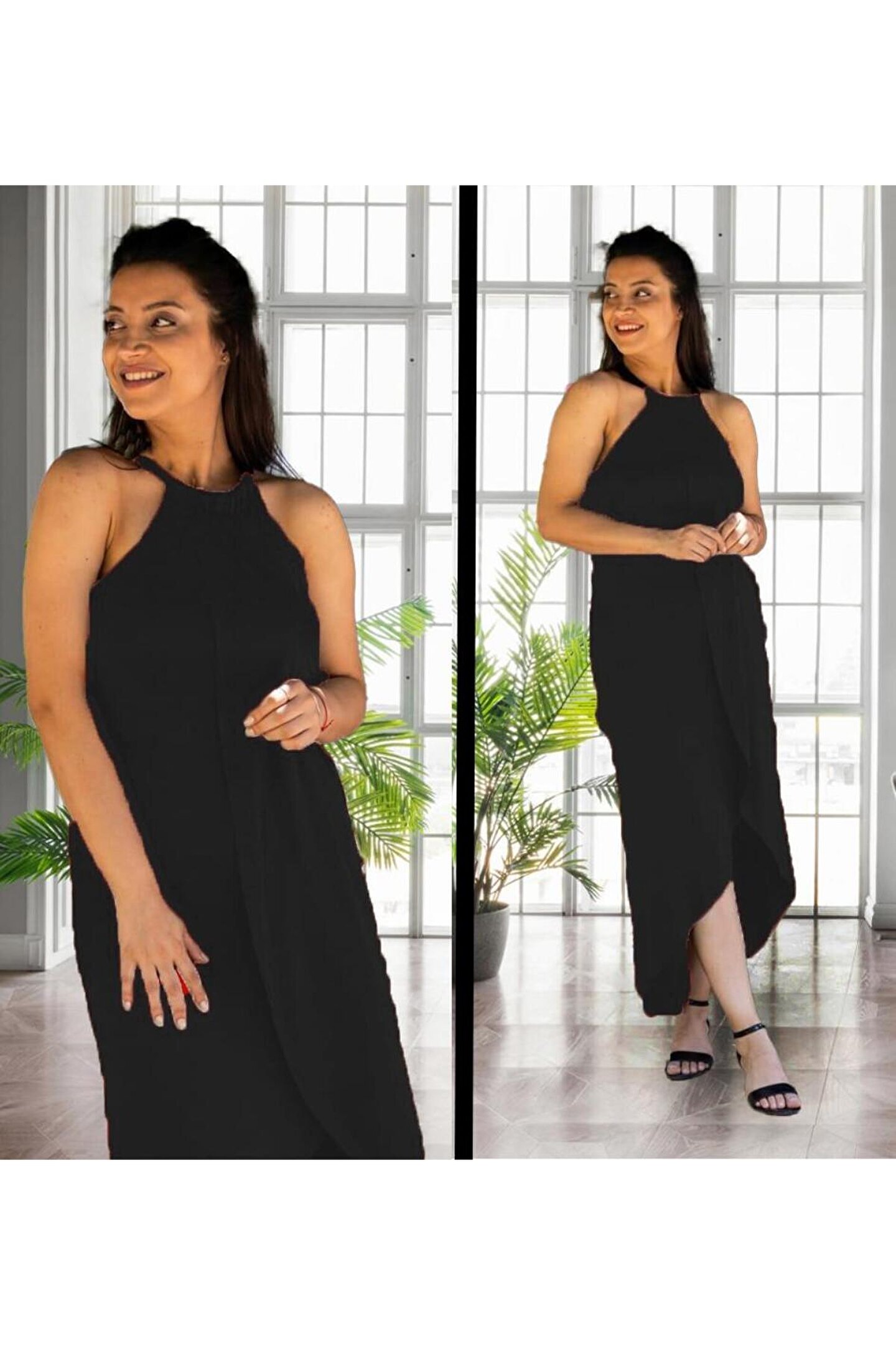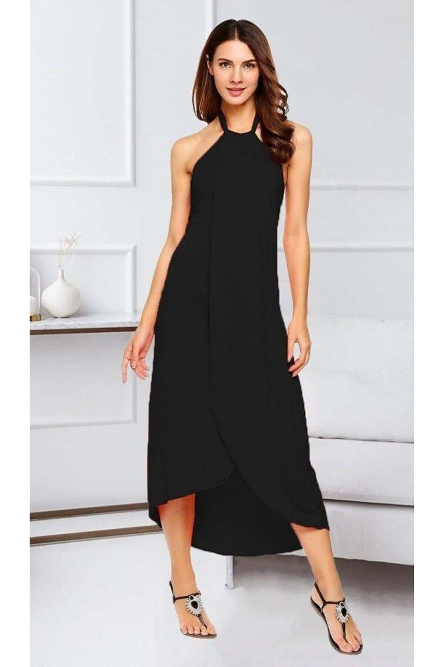 MODA Kadın Omuzlardan Açık Boyundan Geçmeli Asimetrik Kesim Detaylı Viskon Elbise
