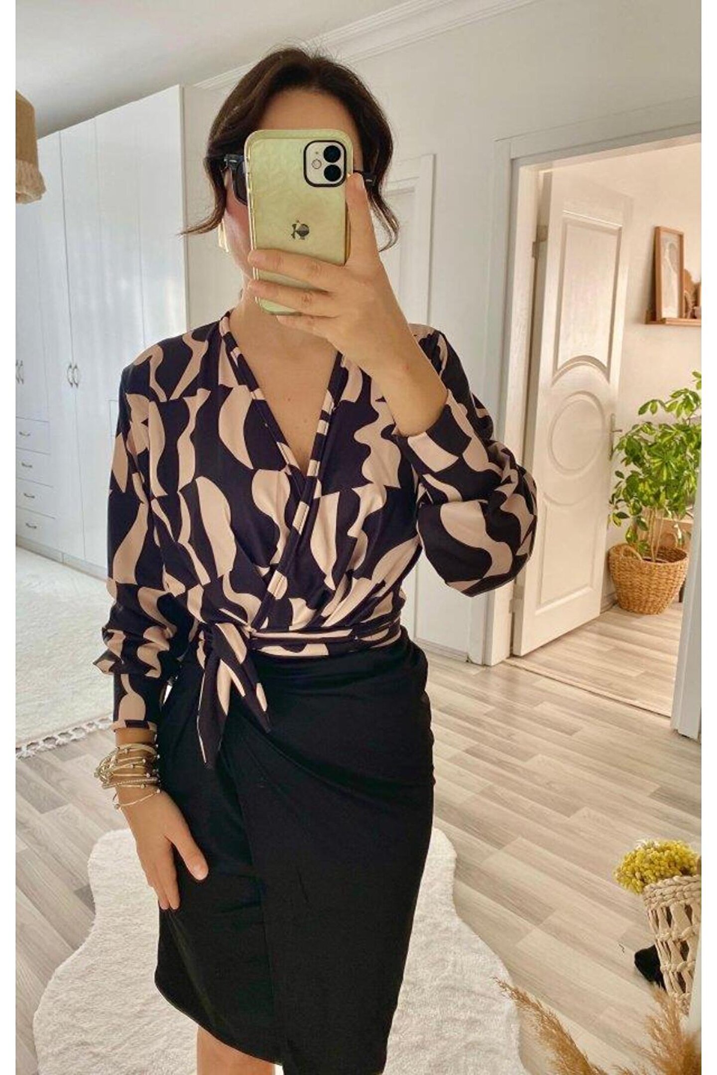 Kadın Uzun Kollu Kruvaze Yaka Dijital Baskılı Fiyonk Detay Dalgıç Kumaş Elbise
