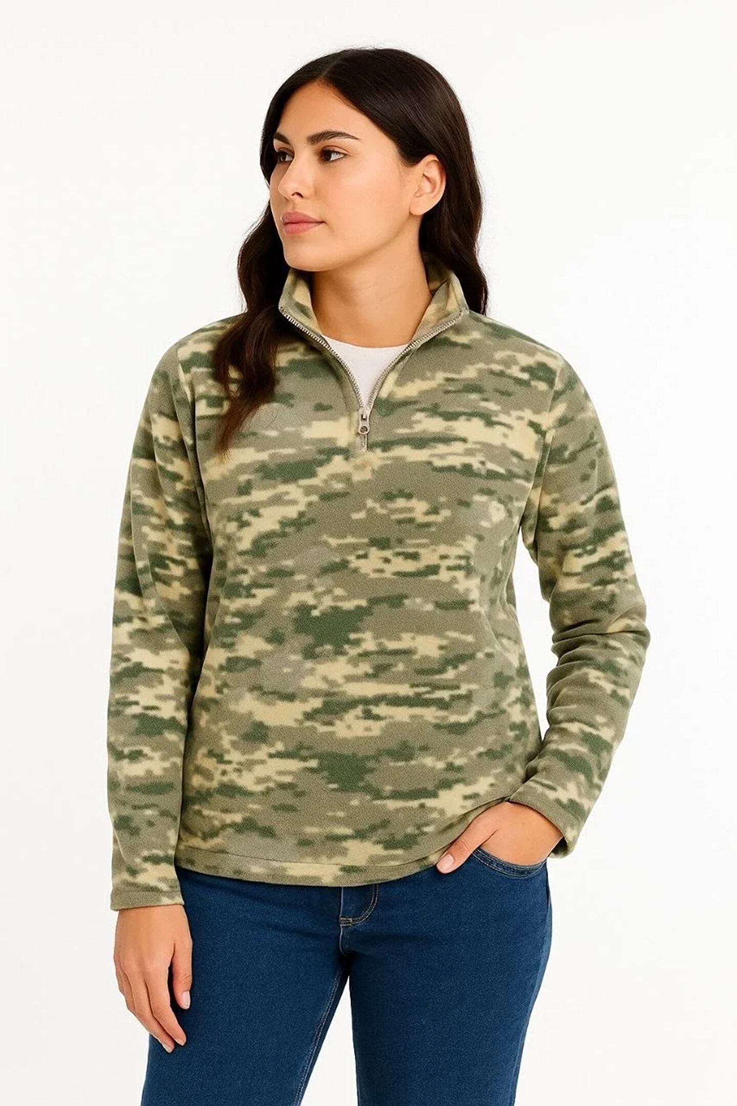 MODA Kadın Yarım Fermuarlı Desenli Polar Sweat – Haki Kamuflaj Yakalı, Uzun Kollu, Oversize Rahat Kalıp -