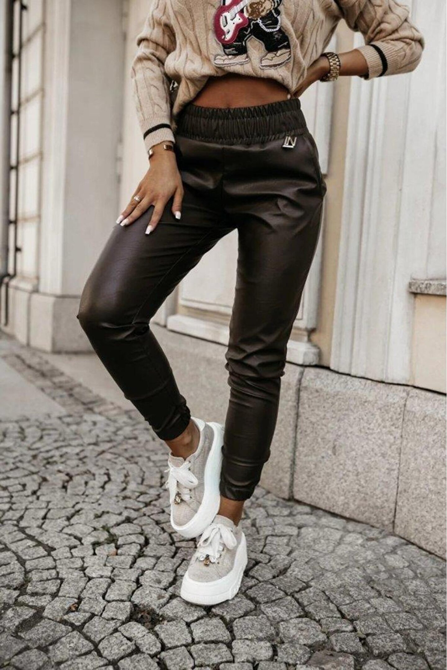 Kadın Yüksek Bel Lastikli Cepli Deri Pantolon