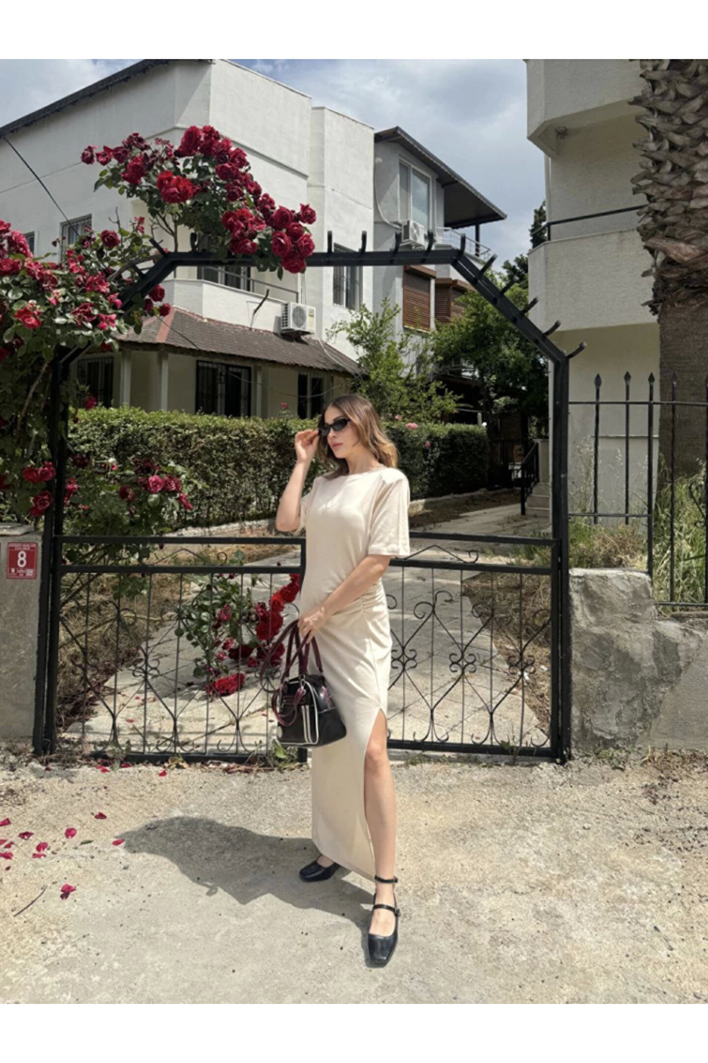 Kısa Kollu Uzun Yandan Yırtmaçlı Elbise - Beyaz