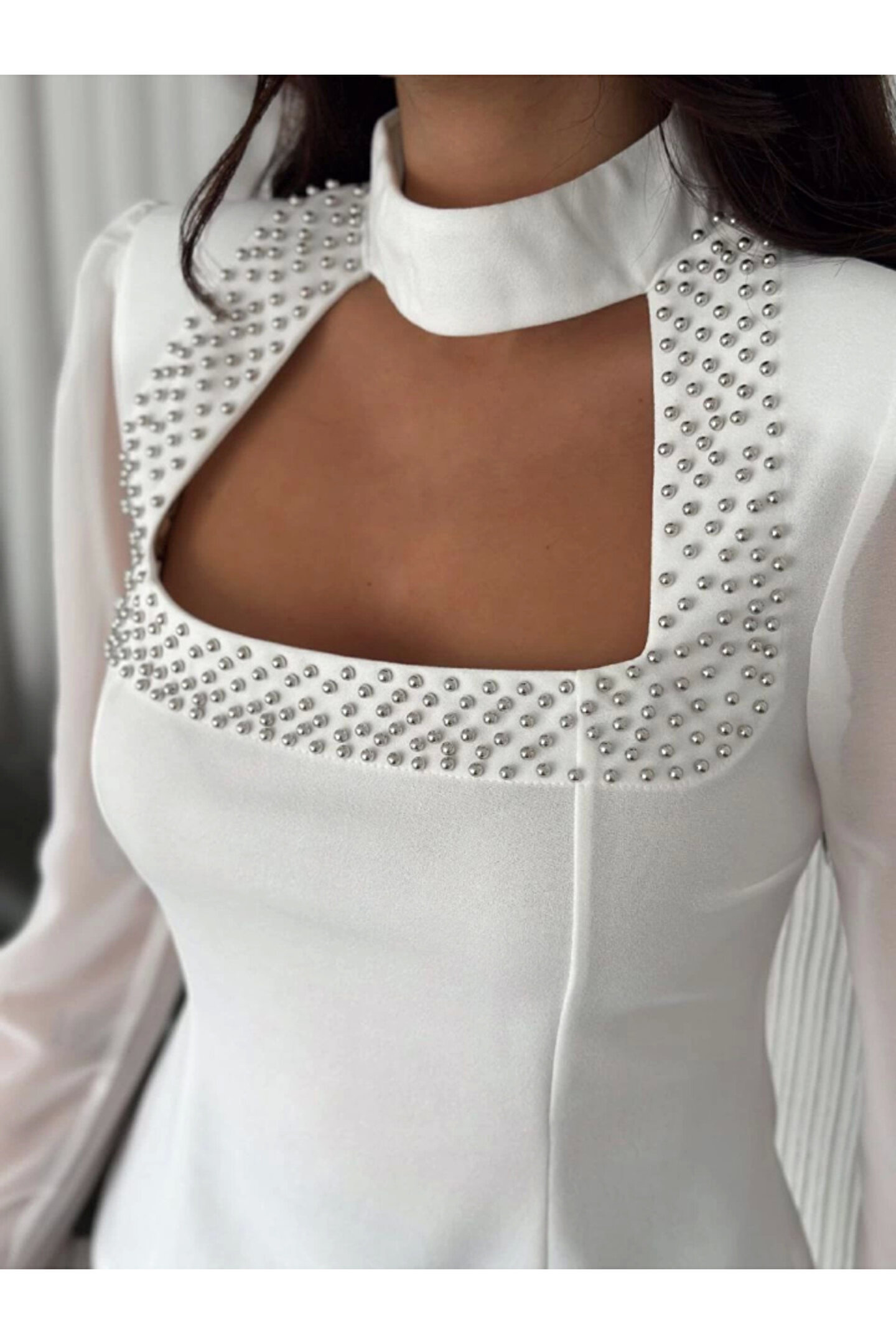 MODA Kolları Şifon Göğüste İnci Boncuk Detaylı Bluz - Beyaz