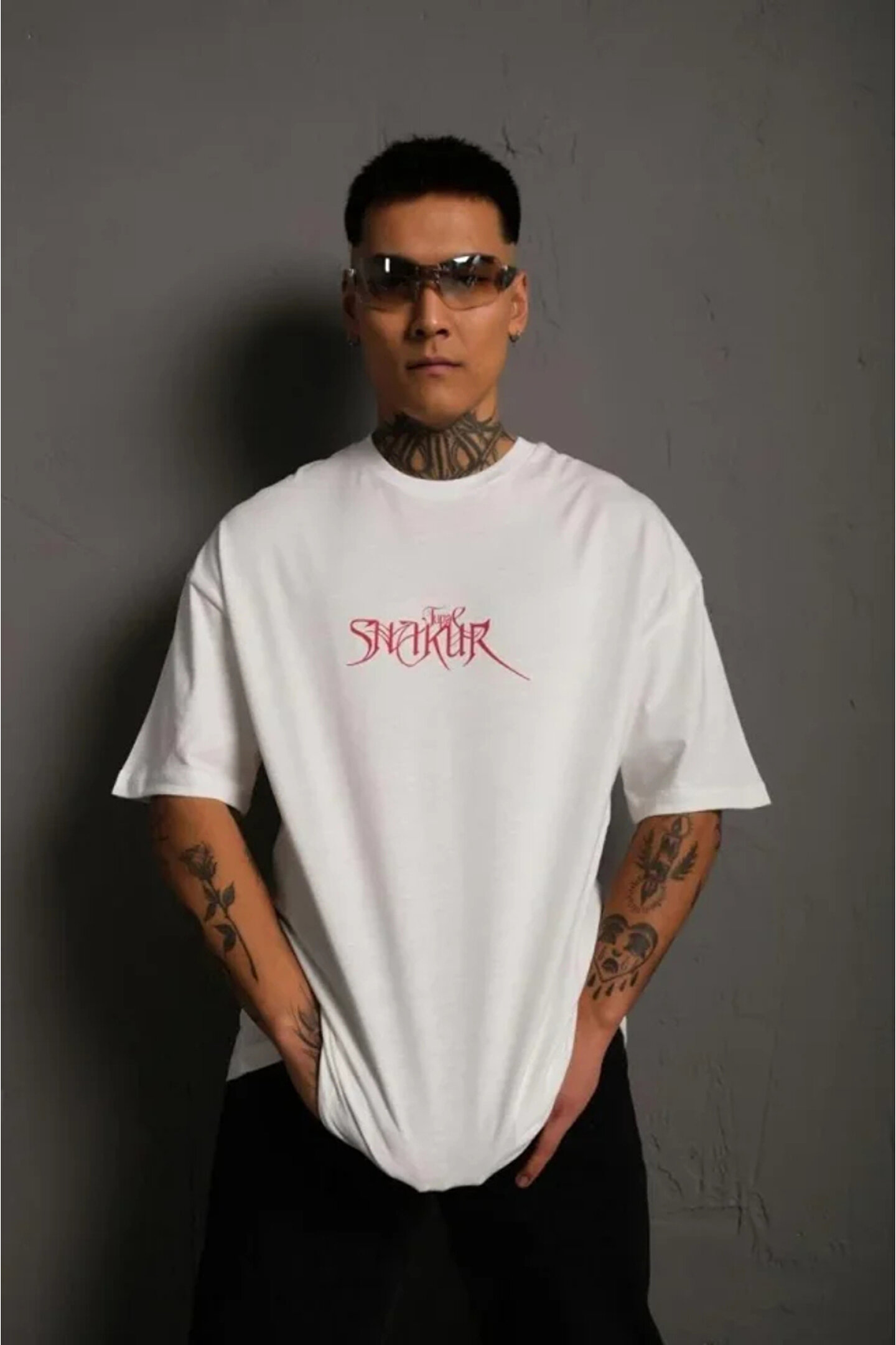 Erkek Oversize Tişört – Beyaz 24/1 Penye Kumaş, Bisiklet Yaka, Ön - Arka Baskılı, Streetwear Tarzı Rahat Büyük Kalıp T-Shirt- Beyaz