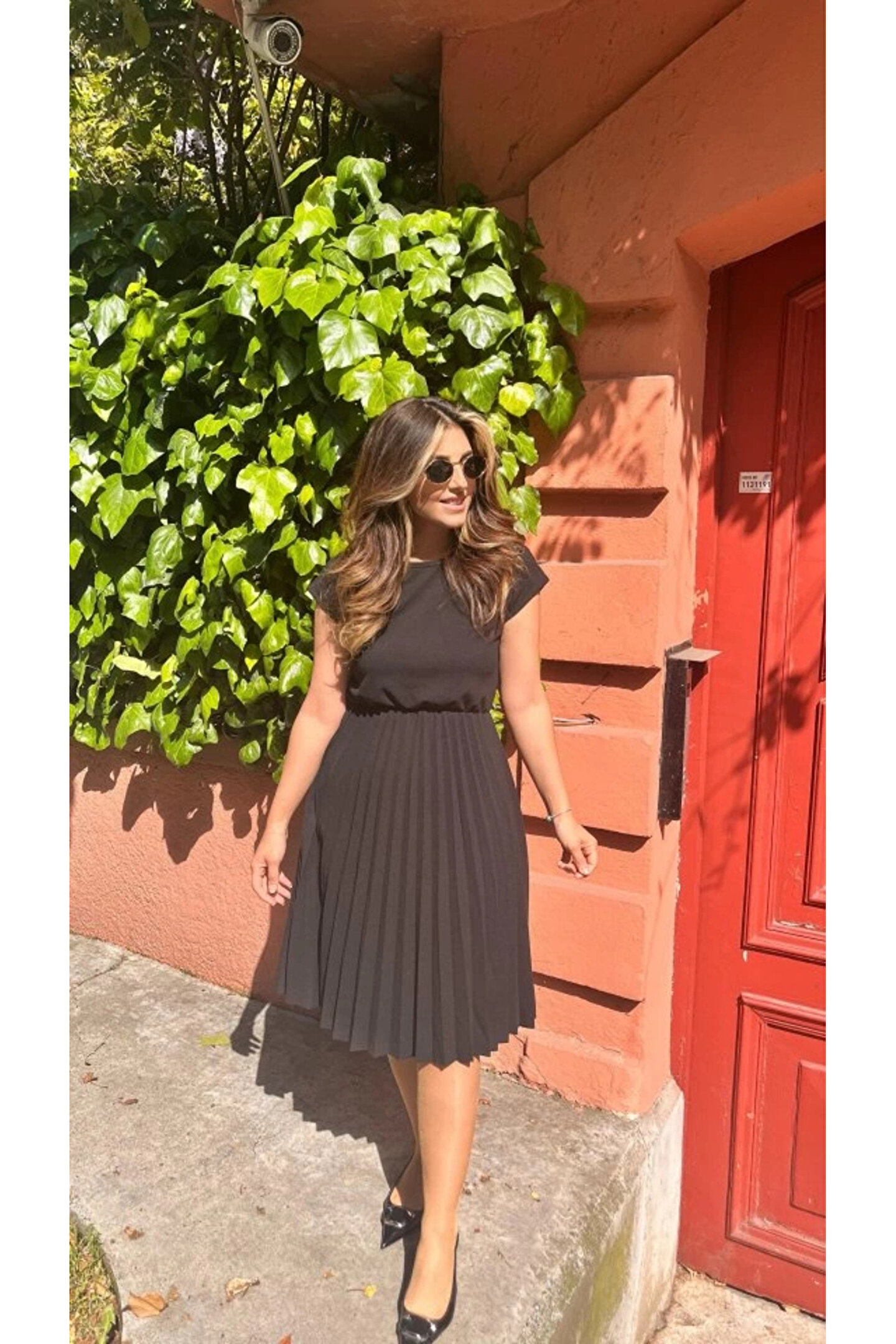 Kadın Kısa Kollu Yakası Açık Belden Lastikli Pileli Kısa Ithal Krep Elbise
