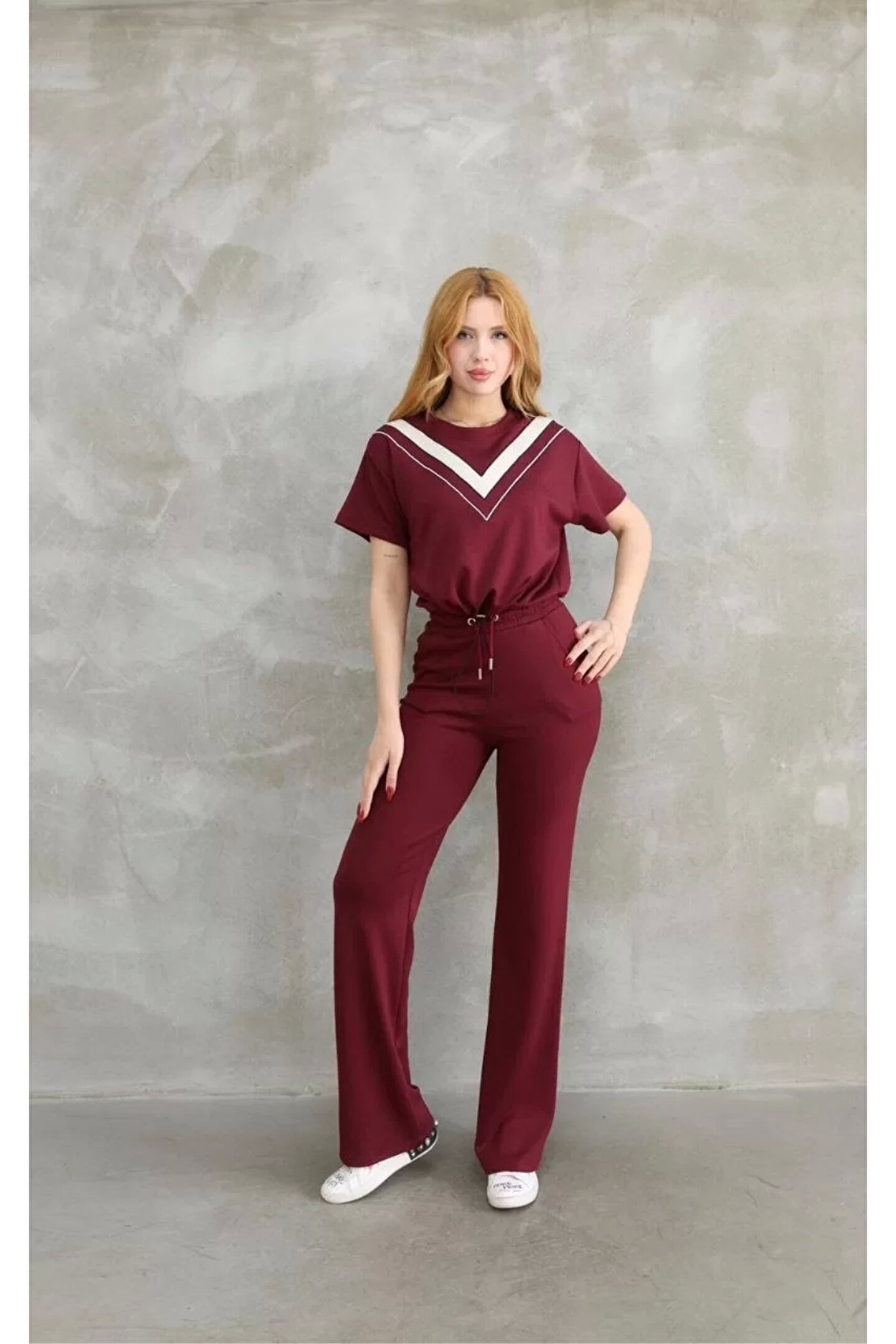 Osy Modal Yumuşak Dokulu Kumaş Bisiklet Yaka Parçalı Detaylı Kısa Kollu Takım - Bordo