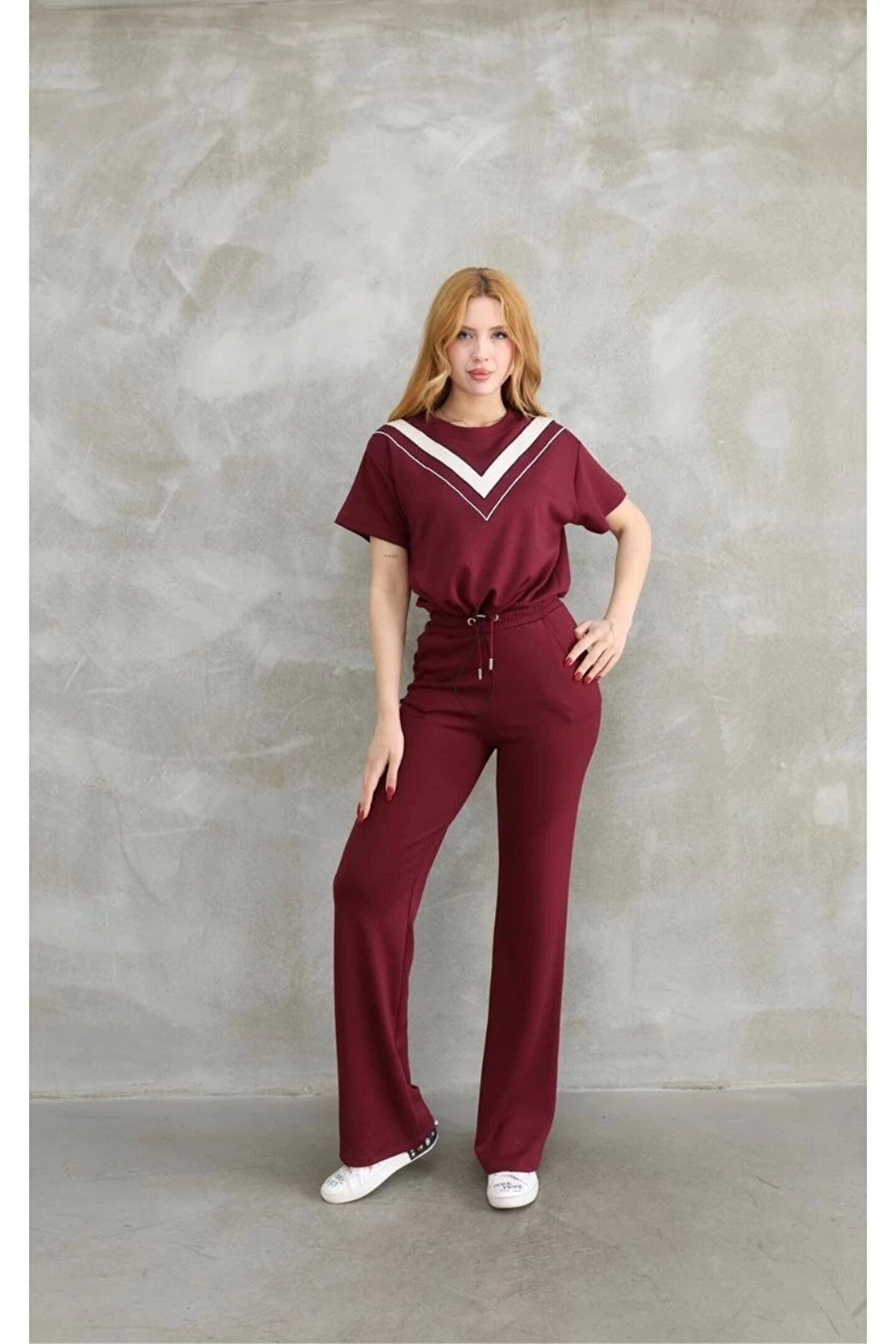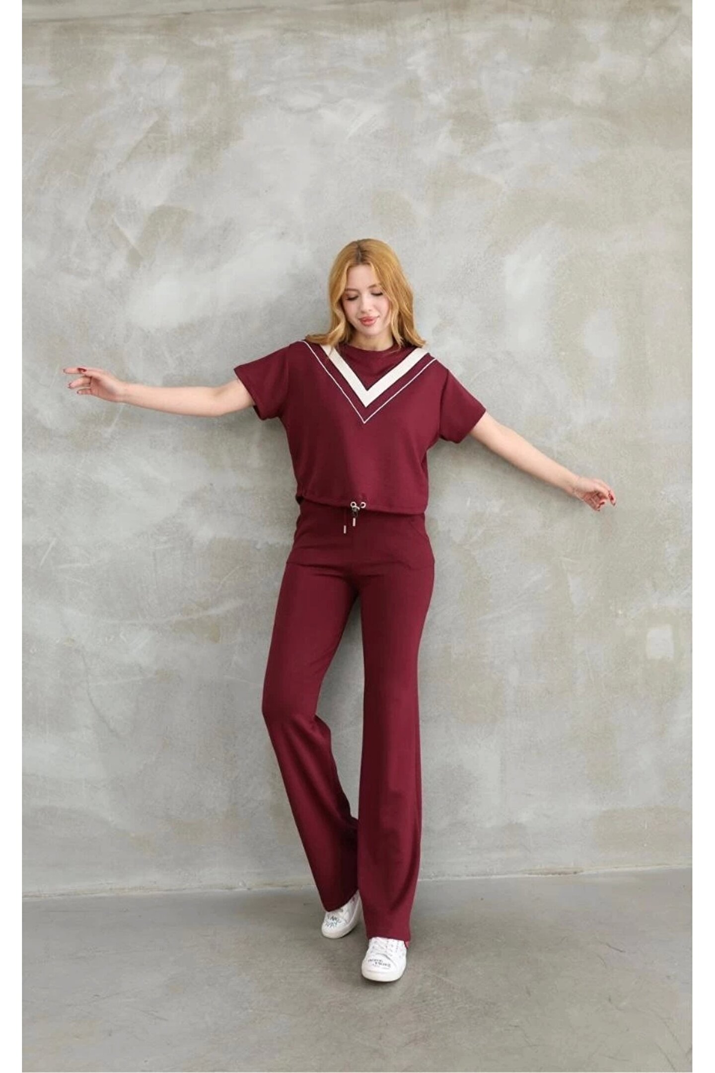 MODA Osy Modal Yumuşak dokulu Kumaş Bisiklet Yaka Parçalı detaylı Kısa Kollu Takım - Bordo