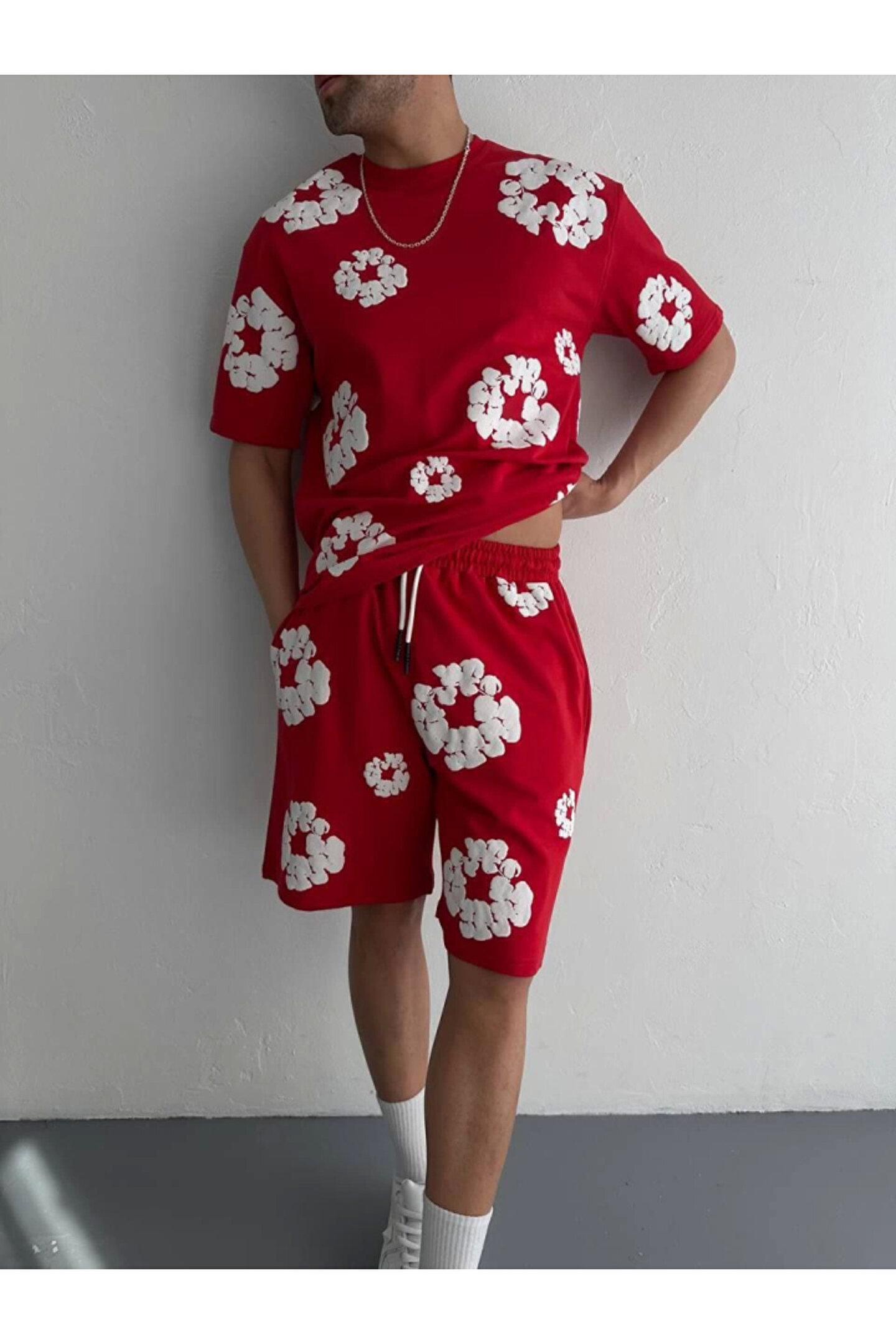 S-PAZARIM İki İplik Kumaş Baskılı T-shirt Şortlu Takım- Kırmızı