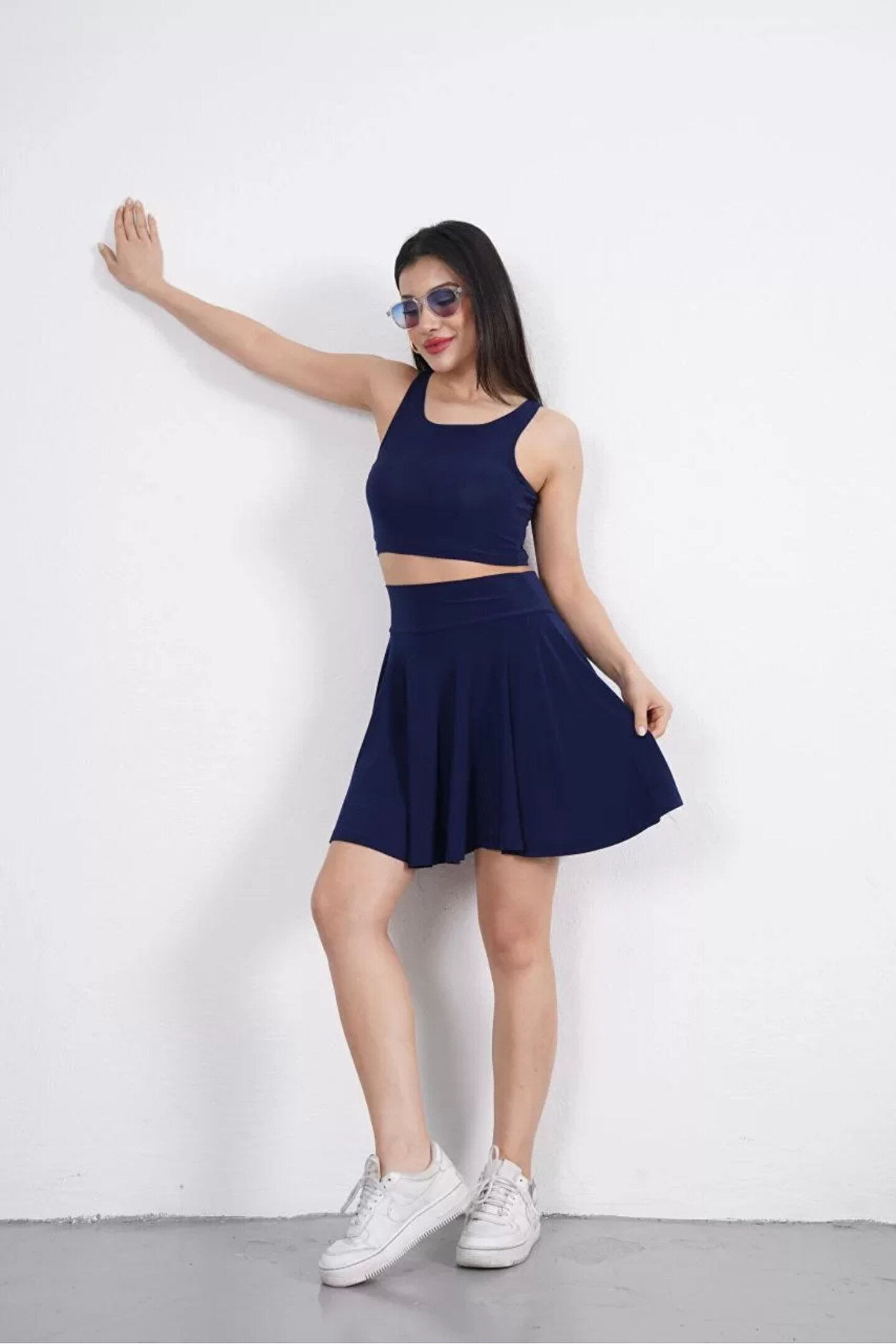 Sendy Kumaş Bisiklet Yaka Crop Şortlu Etek Ikili Takım - Lacivert
