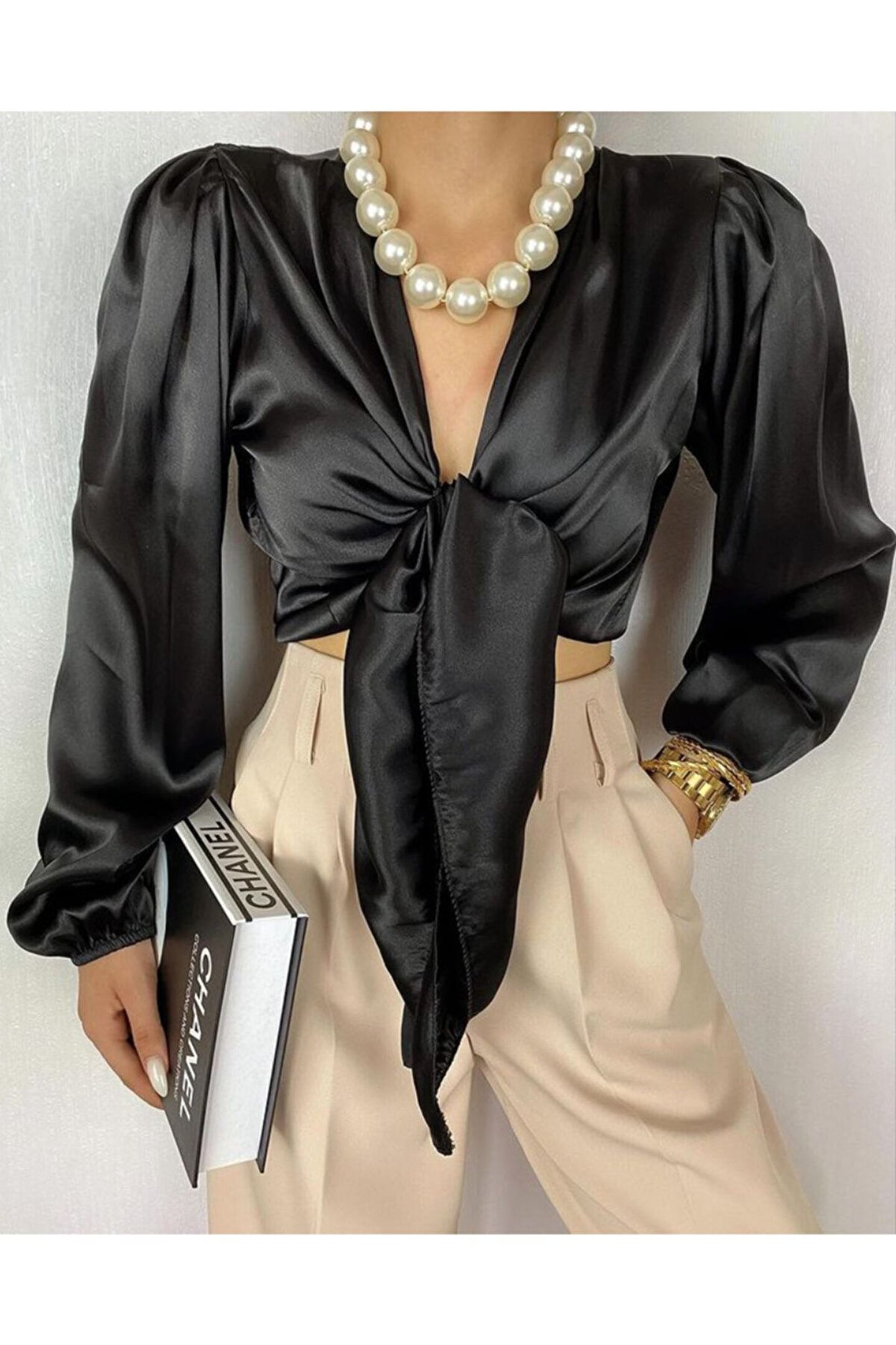 Maça Kızı Saten Parlak Siyah Kadın Gömlek Dekolte Bağlamalı
