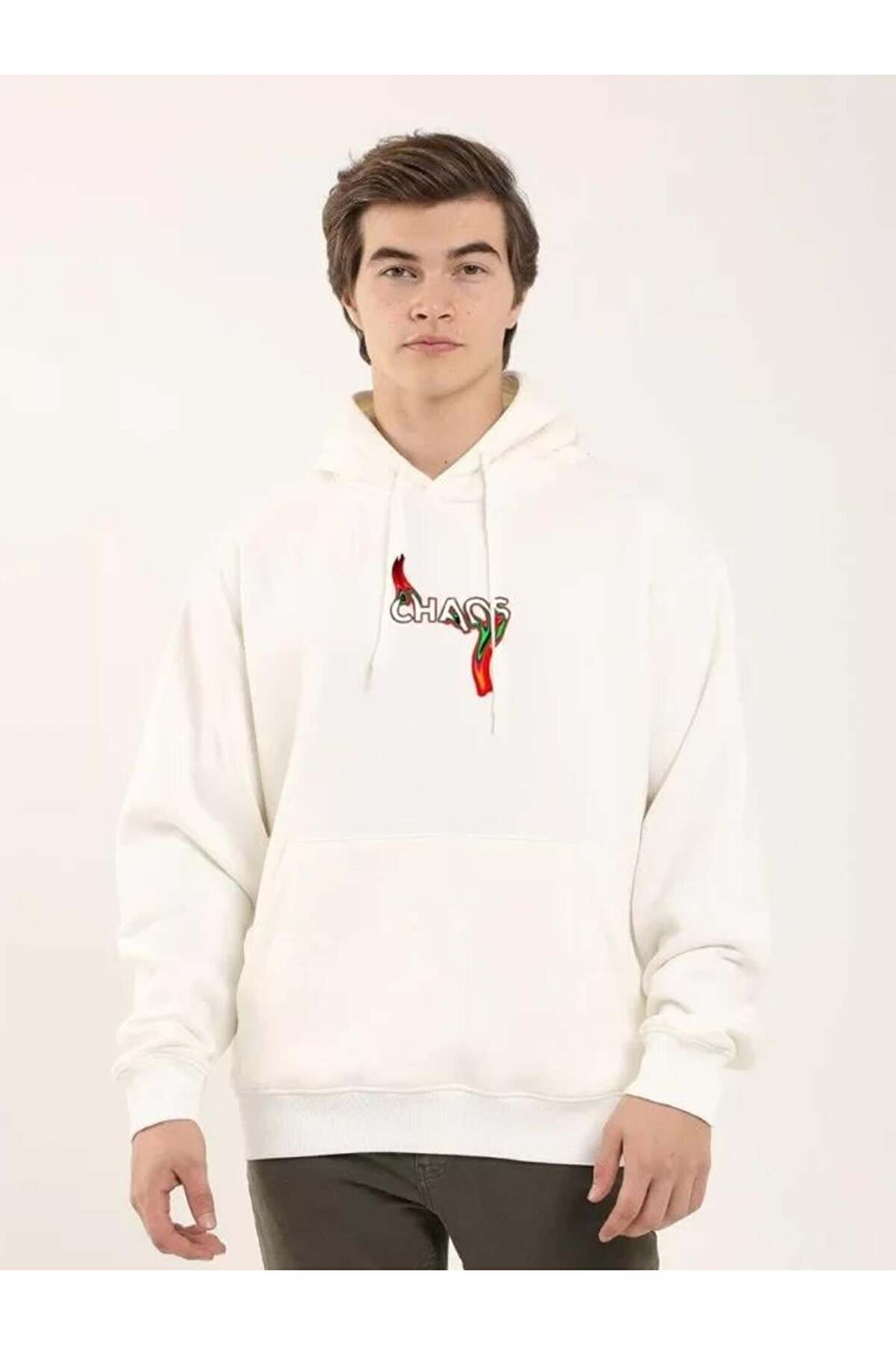 Unisex Baskılı Oversize Üç İplik Kapüşonlu Sweatshirt - Beyaz
