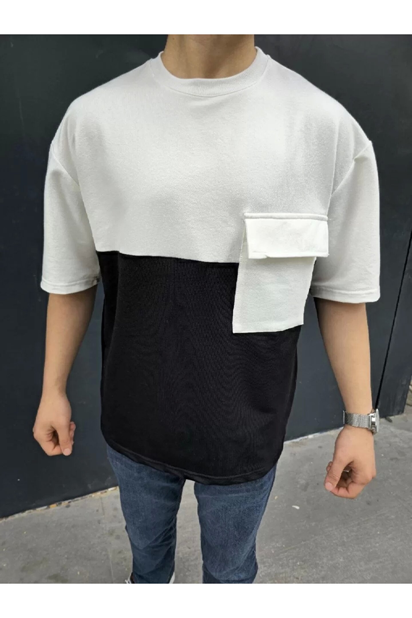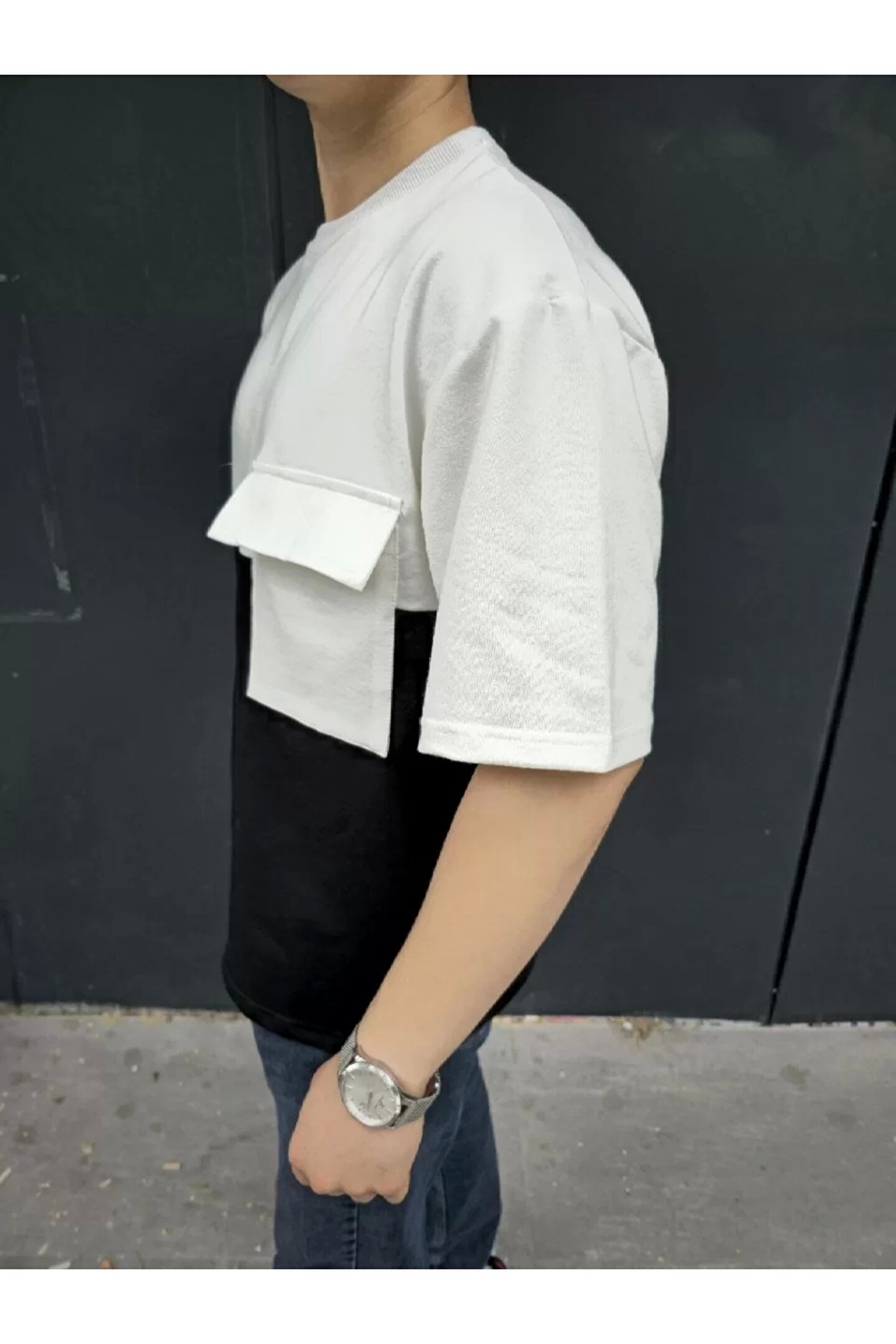 Unisex Torba Cep Detaylı Parçalı T-Shirt - Siyah