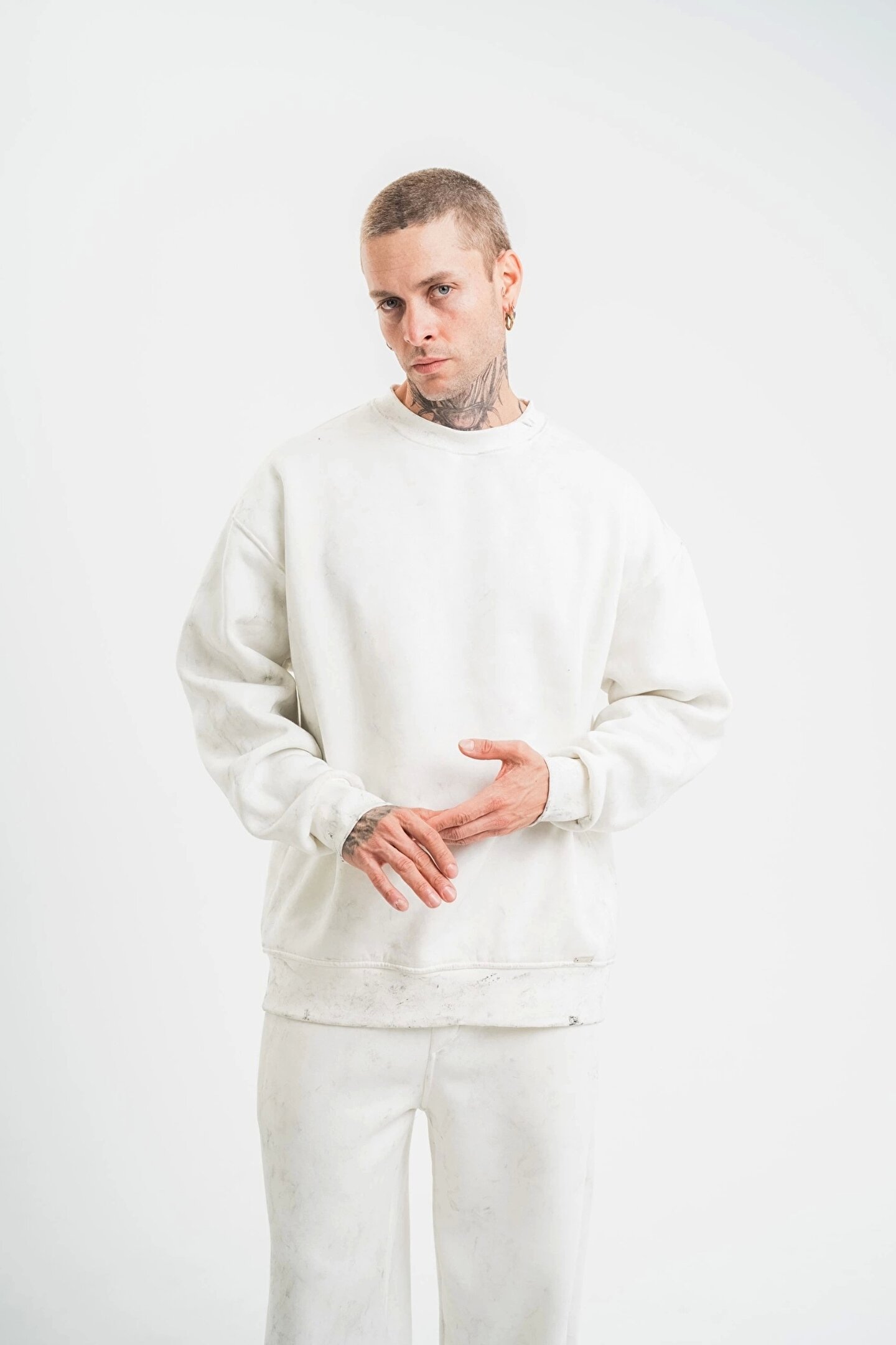 Unisex Uzun Kol Bisiklet Yaka Yıkamalı SweatShirt - Beyaz