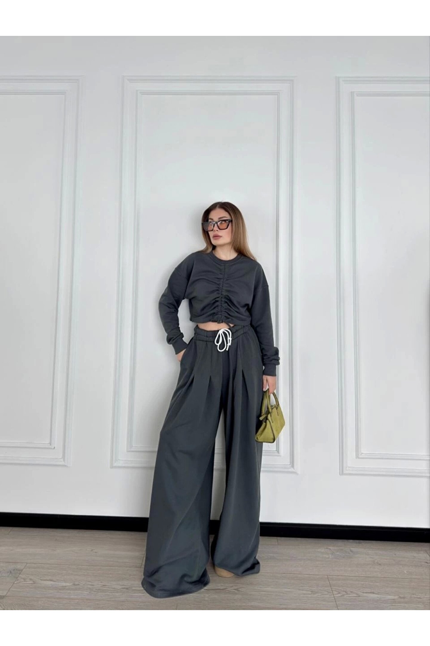 Uzun Kollu Önü İp Büzgülü Crop Ve Pantolon İkili Takım - Antrasit