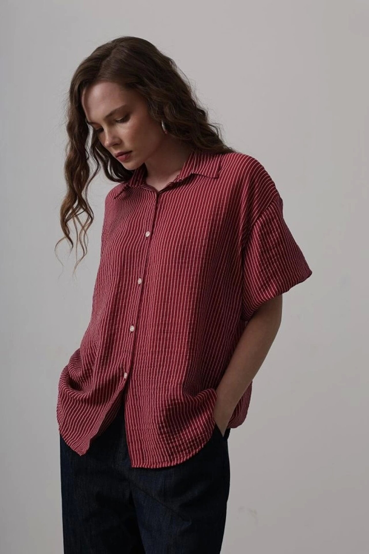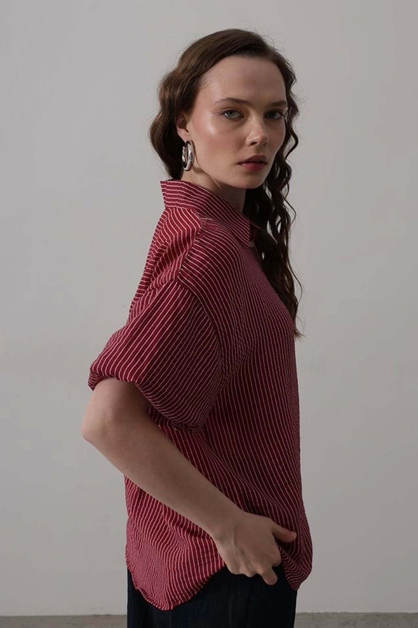 Yarım Balon Kol Çizgili Gömlek - Bordo
