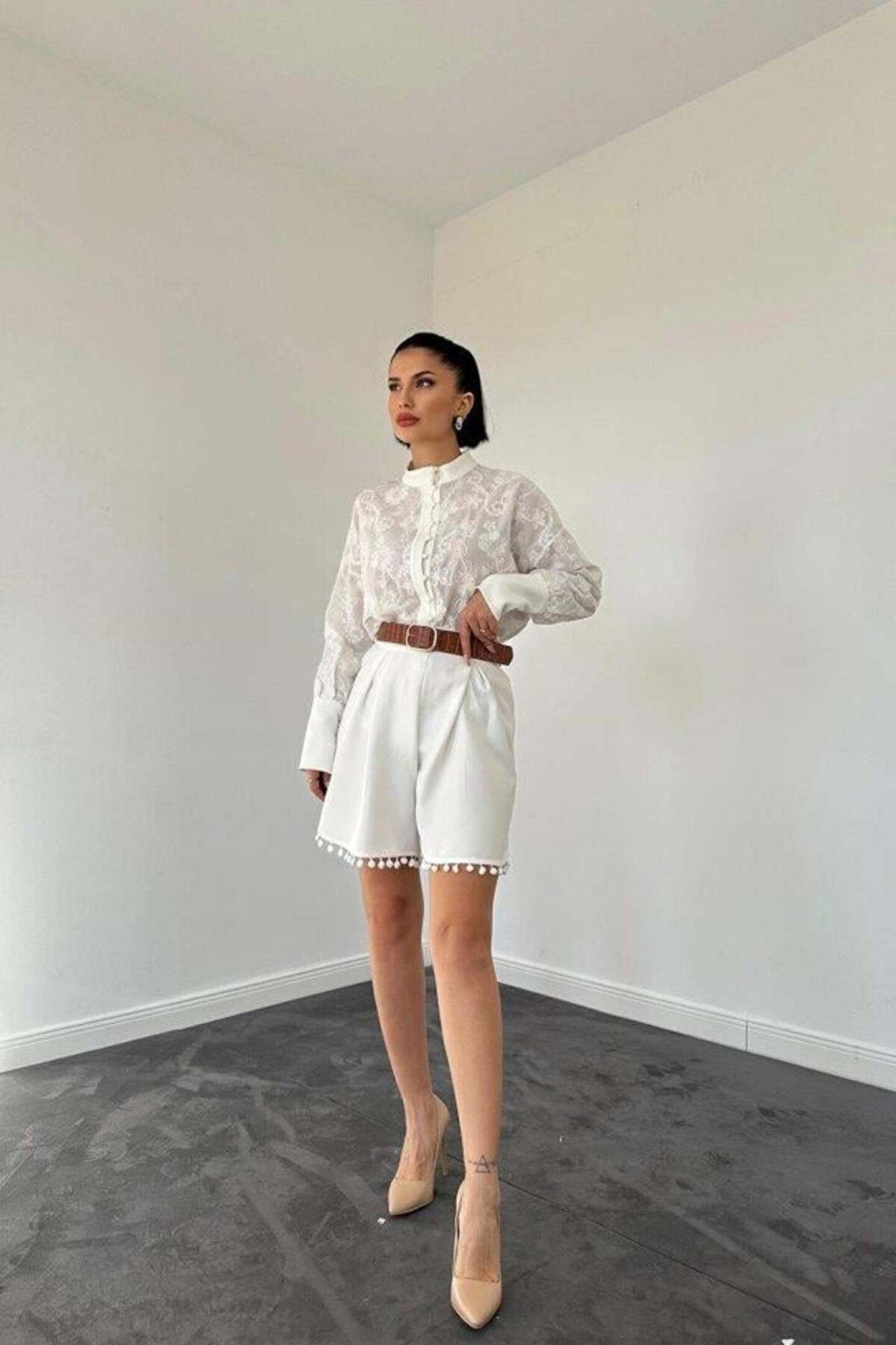 MODA ZERAFİNA Ekru Dantelli Gömlek Ve Ponpolu Şort Takım