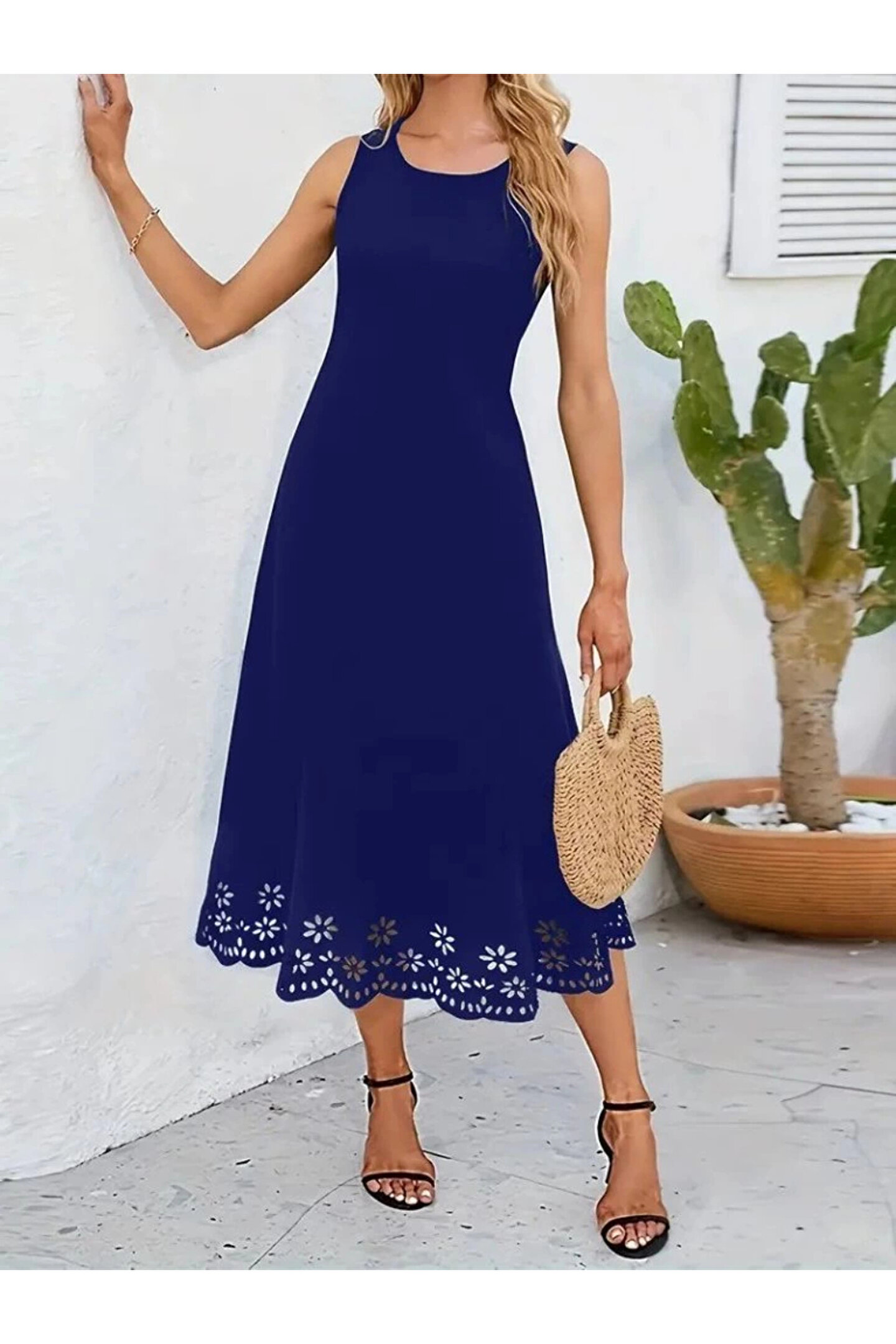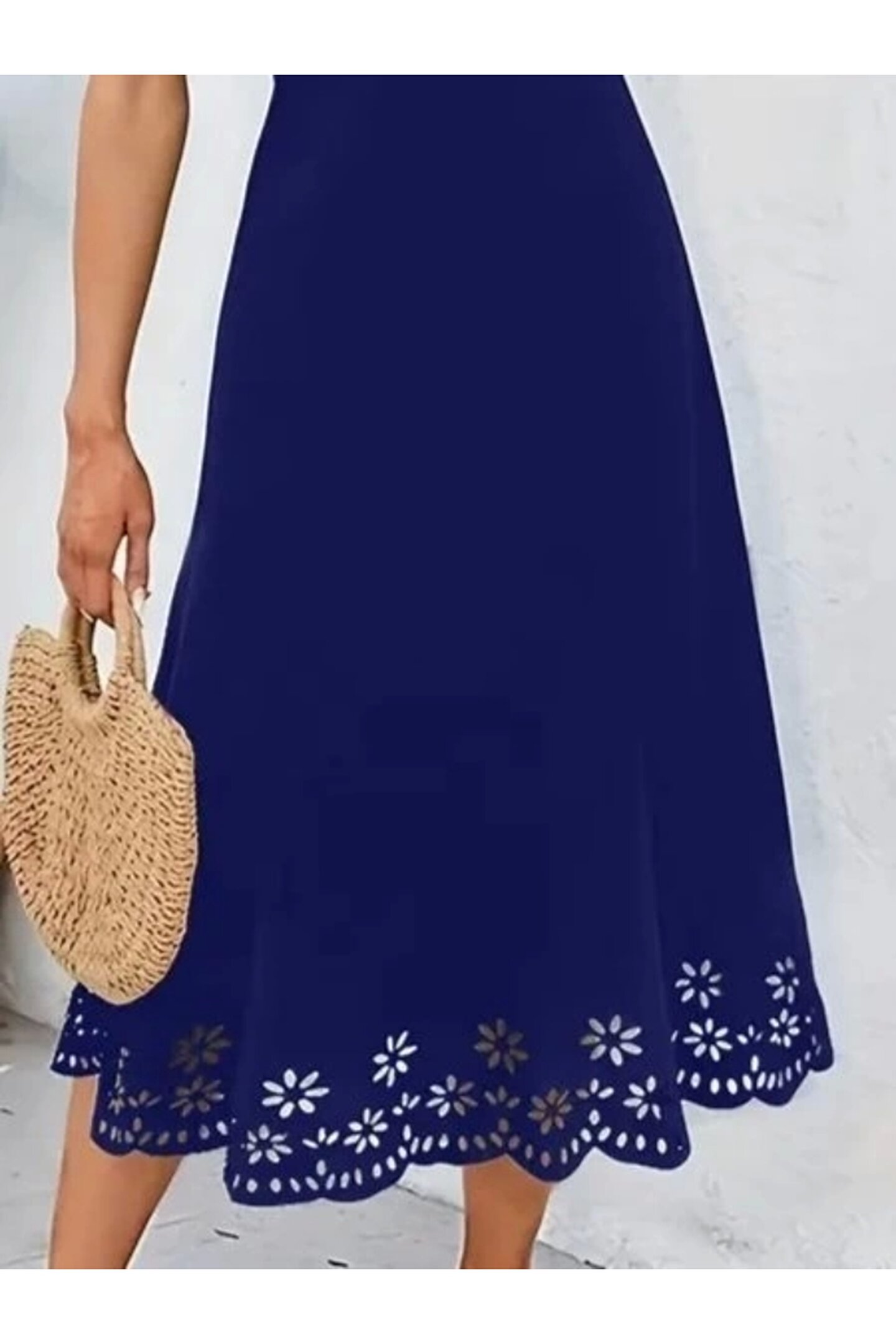 Kadın Kolsuz Etek Ucu Lazer Kesim çiçek Desenli Midi Boy Ithal Krep Elbise