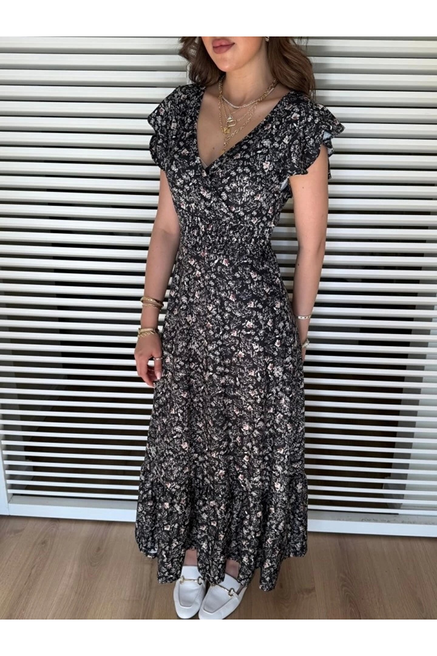 Kadın Kısa Kollu Kruvaze Yaka Beli Lastikli çiçek Desenli Elbise