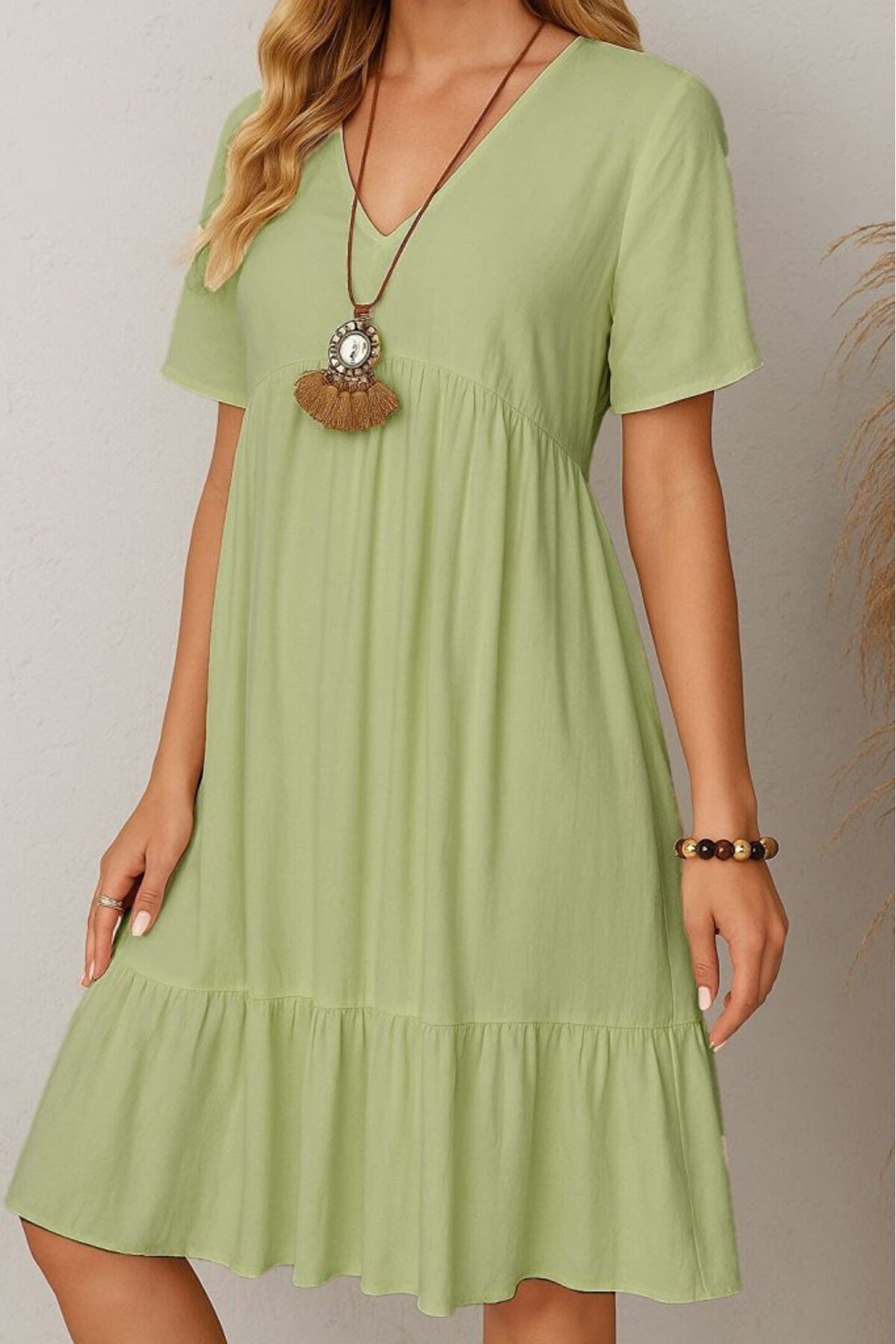 Kadın Kısa Kollu V Yakalı Fırfırlı Bürümcük Elbise.; Ürün detayları ve kullanım hissi kişisel tercihlere göre değişiklik gösterebilir.