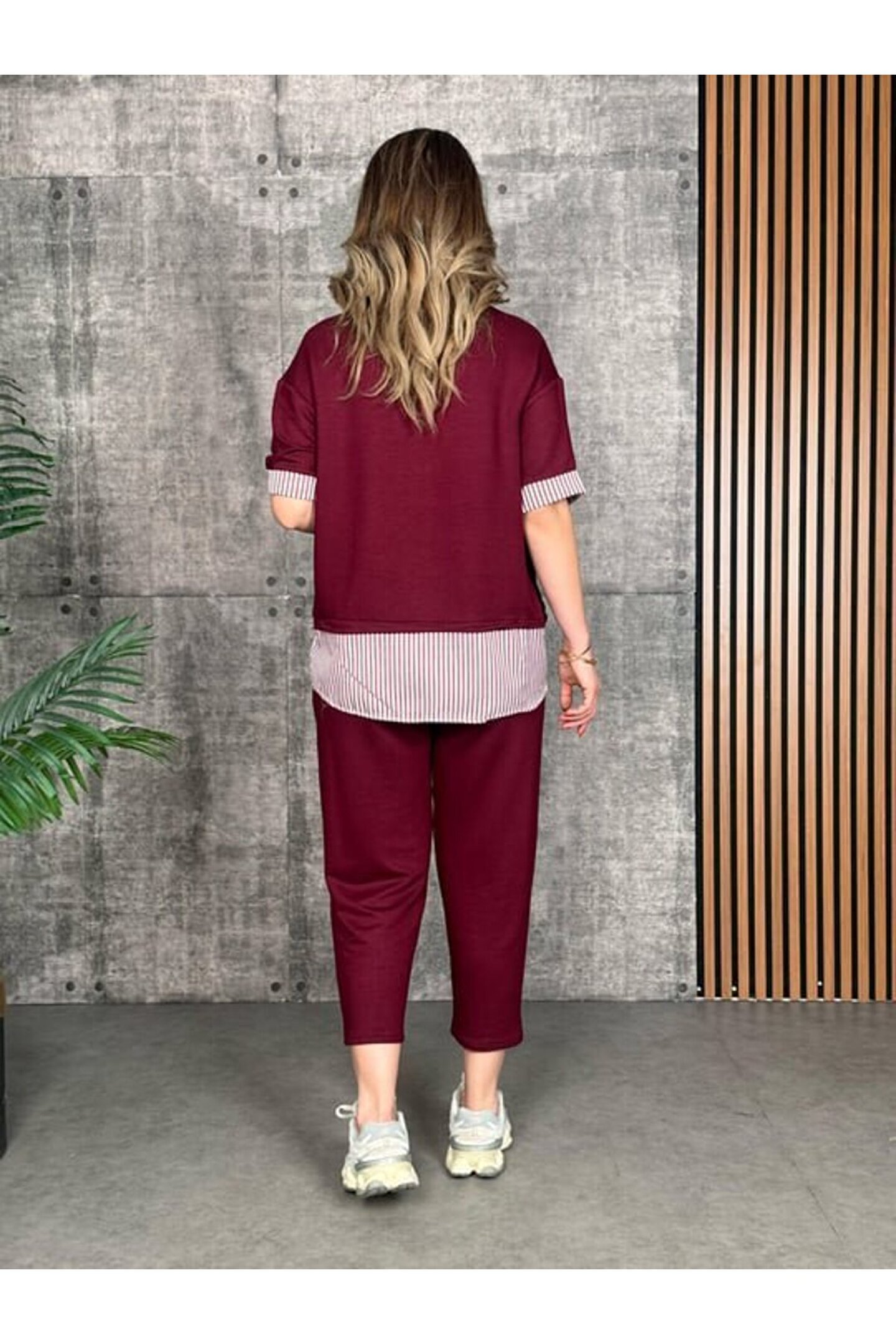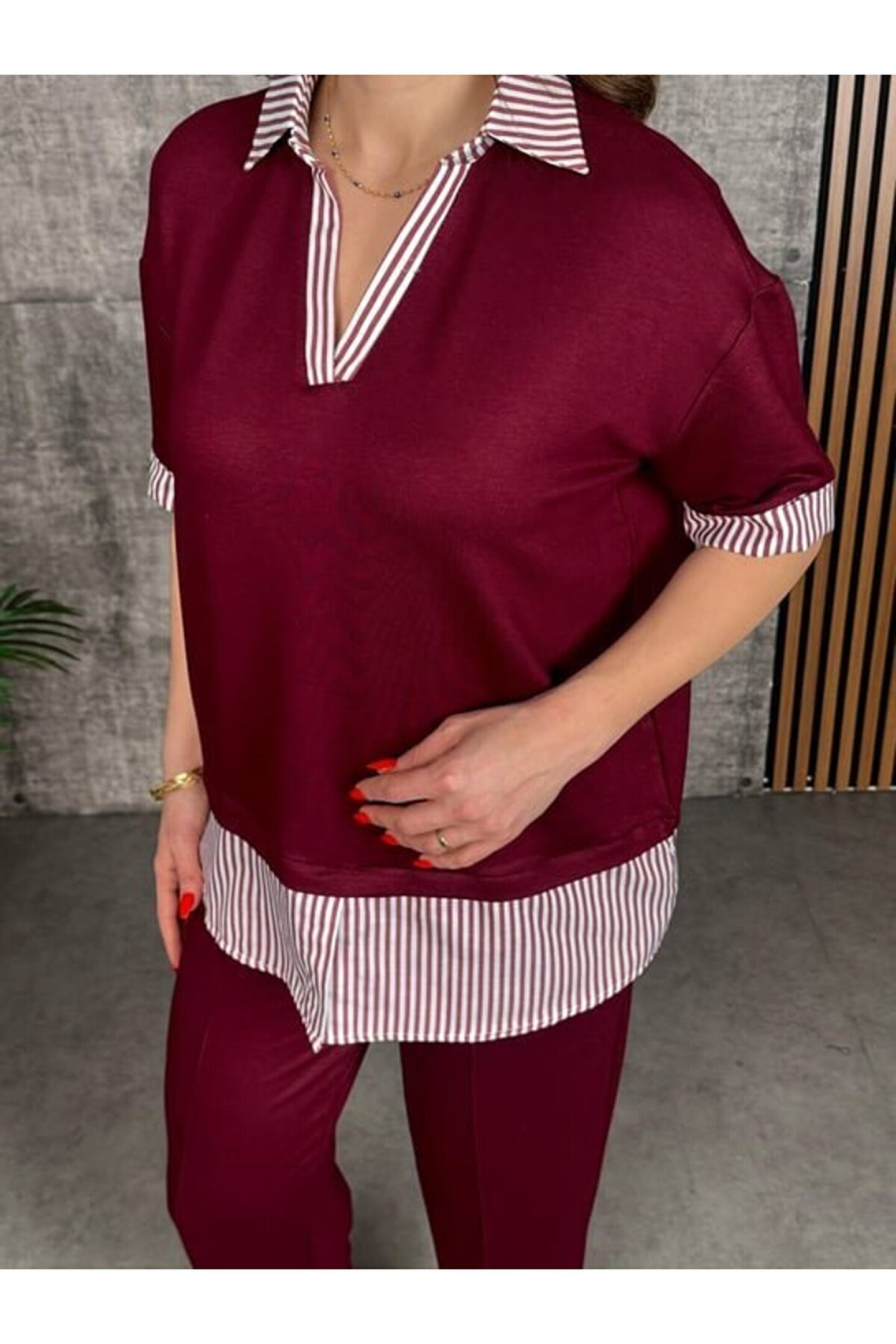 Kadın Modal Kumaş çizgili Gömlek Yaka Ikili Takım