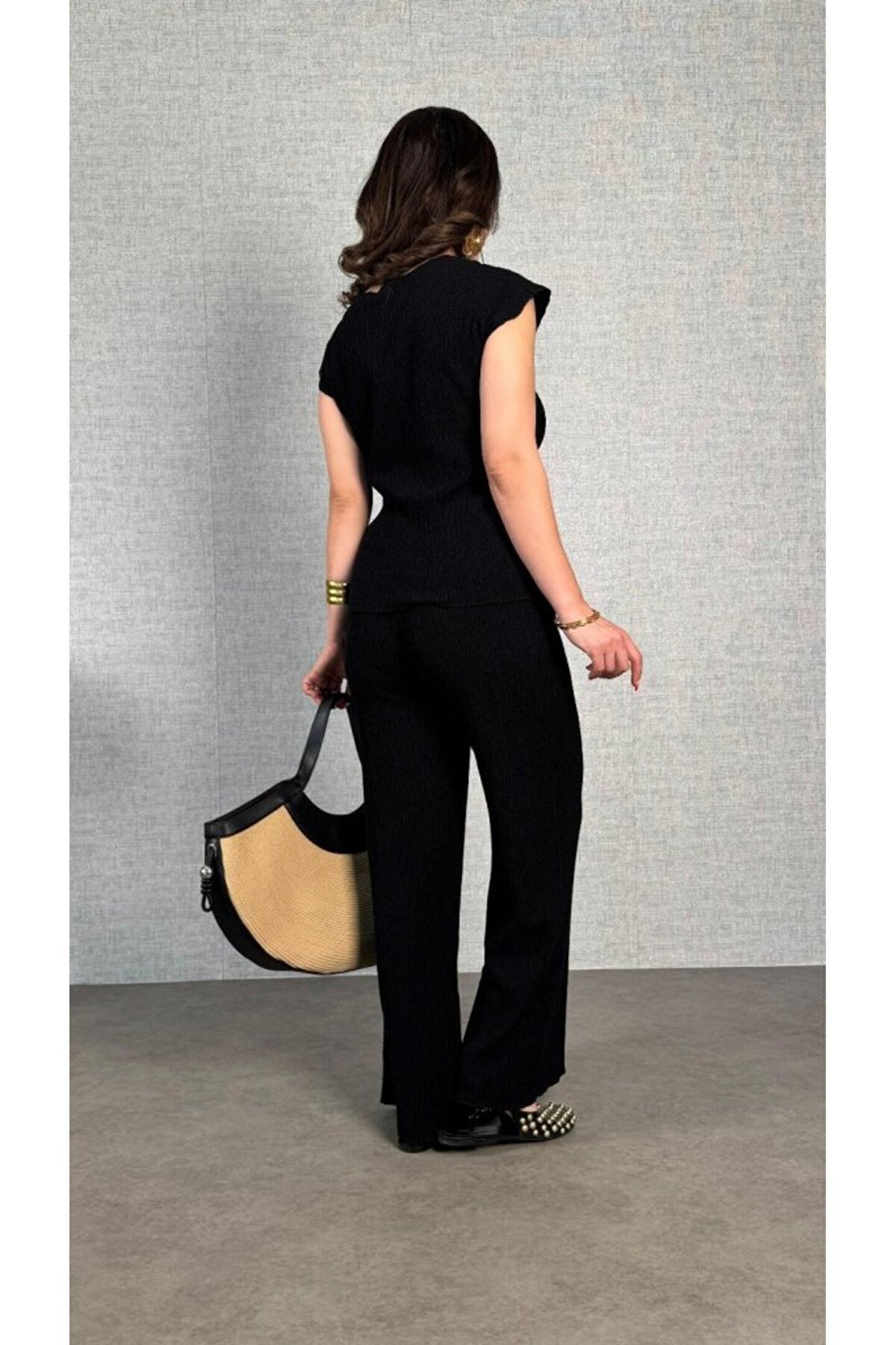 Modayakamoz EQURİ Kadın Kısa Kollu Bisiklet Yaka Yandan Bağlamalı Bürümcük Bluz Ve Pantolon Ikili Takım