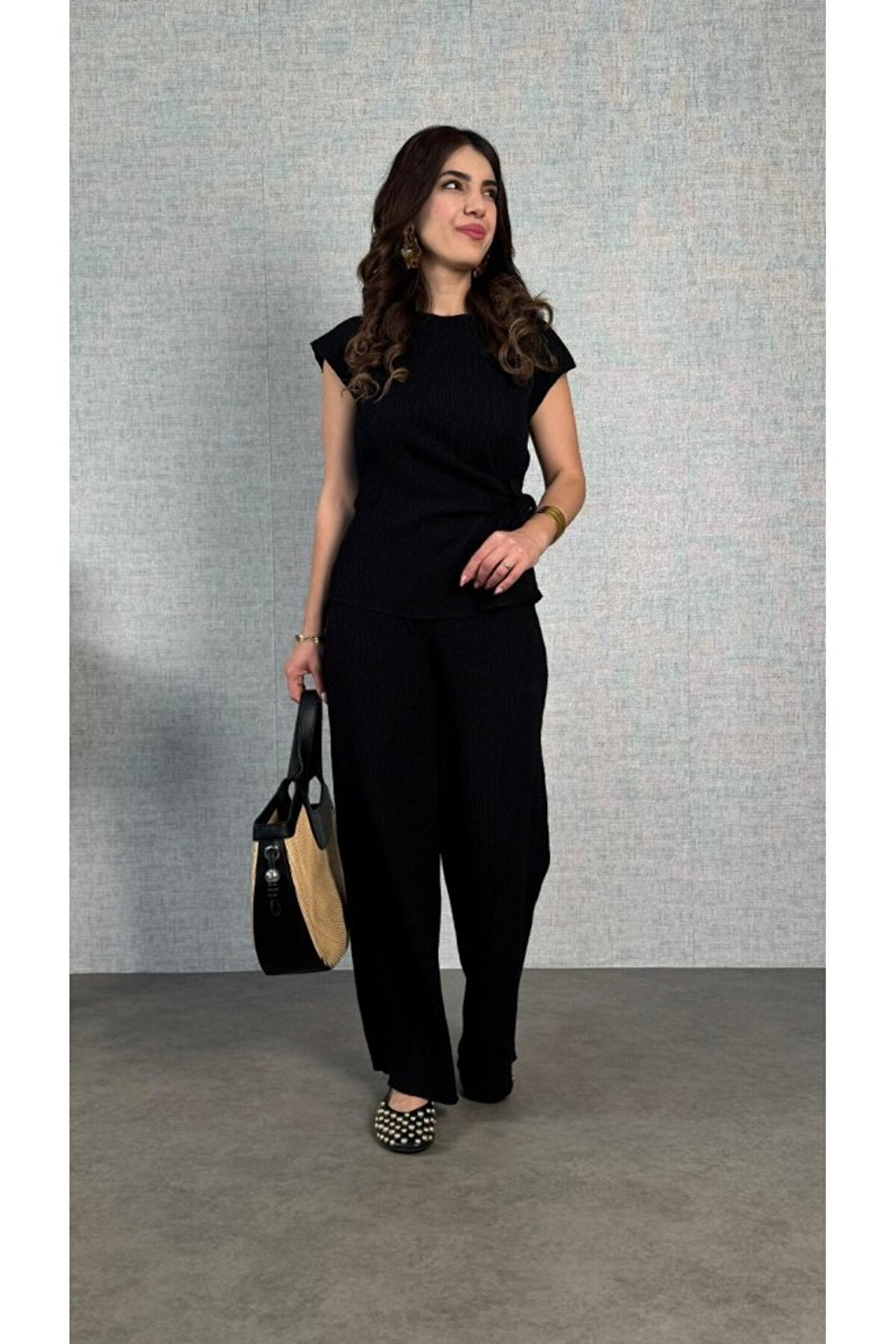 Modayakamoz EQURİ Kadın Kısa Kollu Bisiklet Yaka Yandan Bağlamalı Bürümcük Bluz Ve Pantolon Ikili Takım