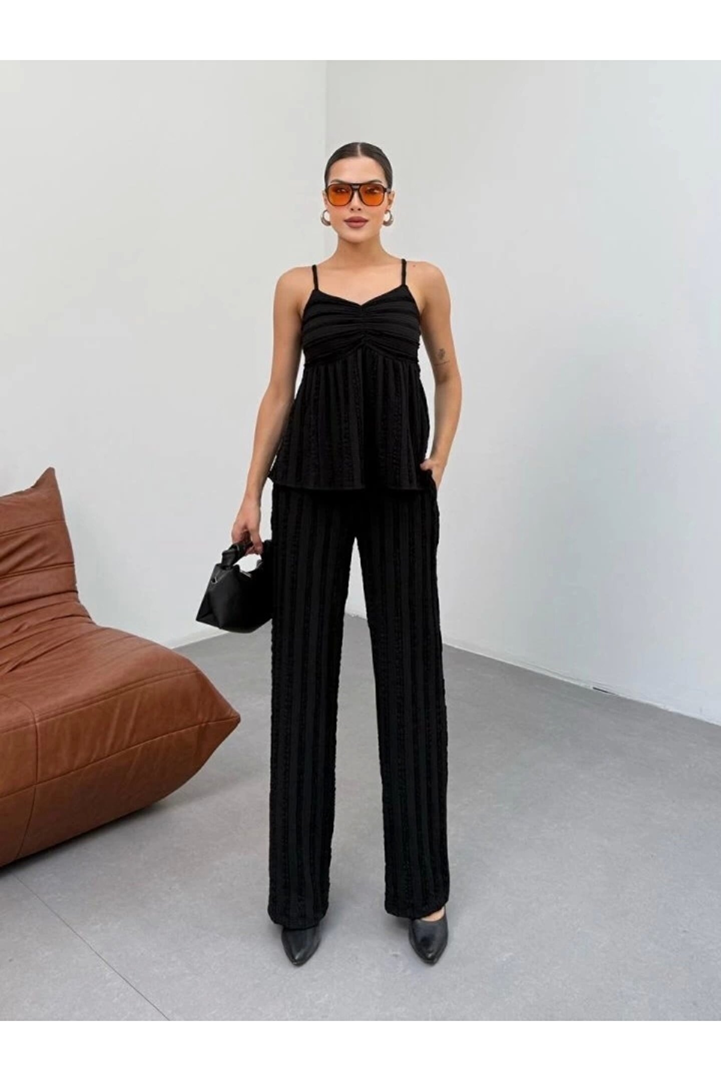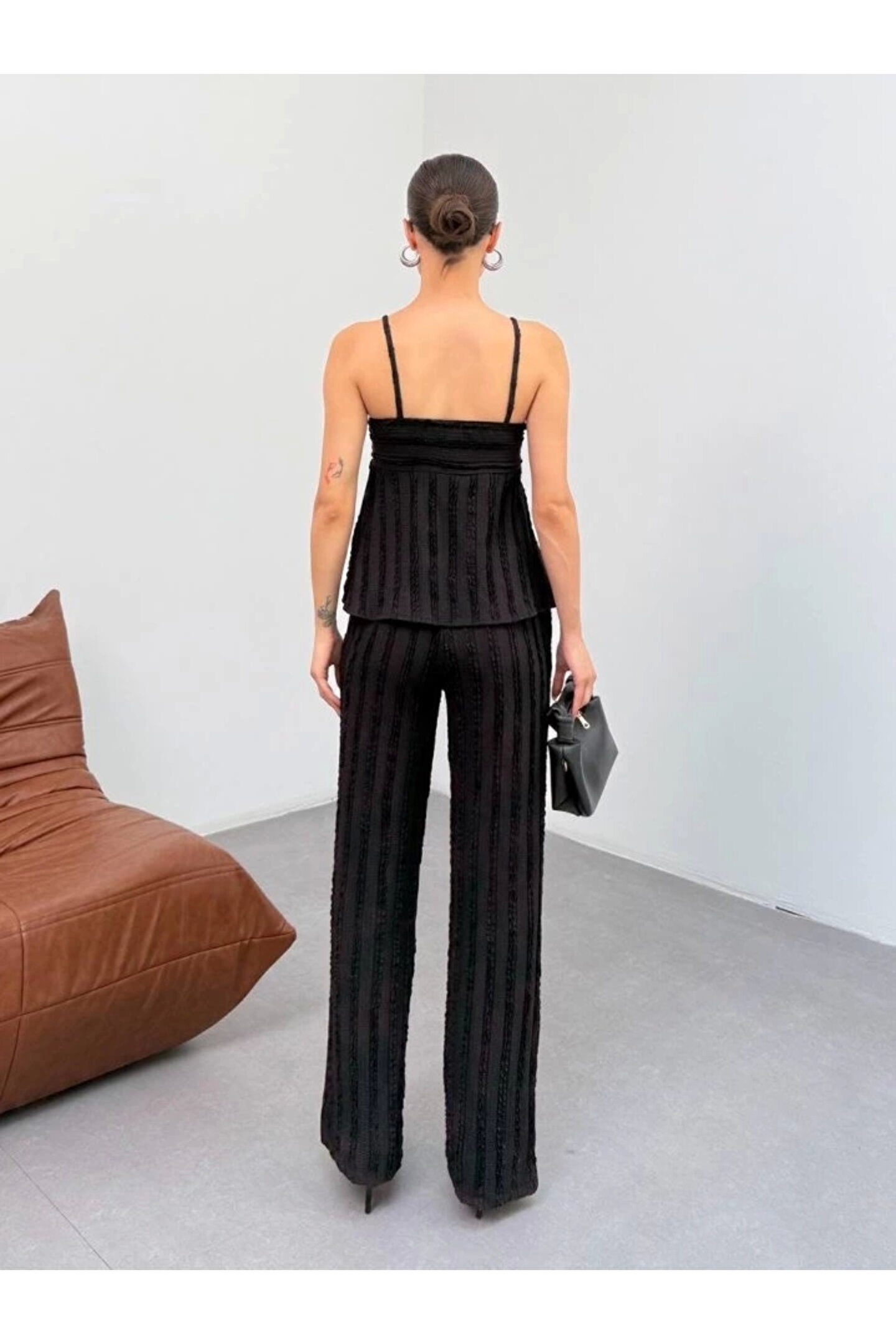 - Zarif siyah dokulu askılı üst ile bol paça pantolonun şık kombinasyonu, günlük kullanım için idealdir.; - Kalp yaka tasarımıyla feminen bir görünüm sunar ve rahatlığı ön planda tutar.; - Çift cepli yapısı pratiklik sağlar; küçük eşyalarınızı yanınızda taşımanız için kolaylık sunar.; - Kemersiz tasarımı sayesinde farklı stillerle uyum içinde olabilirsiniz.; - Ek özelliklerden yoksun olması, sadelikten yana olanların tercihi haline getirir.; - Flare kesimiyle modern ve trend bir siluet çizerken, çizgili deseniyle dinamik bir stil vurgular.; - Yetişkin kadının zarafetine hitap eden bu takım, her ortamda şıklığınızı korumanızı sağlar.; - İnce askılı kol tipi yaz ayları için serinlik ve konfor sunarken, askılı boyu omuzları serbest bırakarak rahat hareket etme imkanı tanır.; - Pamuklu materyali cildinizle dosttur ve gün boyu nefes alabilen yapıya sahiptir.; - Casual tarzıyla günlük giyimde rahatlıkla tercih edebileceğiniz bu takım, hem evde hem de dışarıda keyifle kullanılabilir.; - Bluz-pantolon alt-üst takımı olarak tasarlanmıştır; böylece tek parça olarak da kombinlenebilir veya ayrı ayrı giyilebilir.