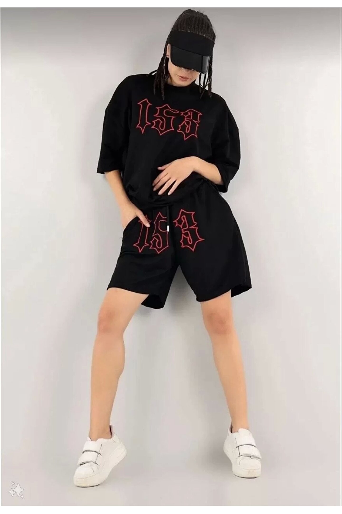 Modayakamoz Kadın Unisex Nakış İşlemeli Şort Takım - Siyah