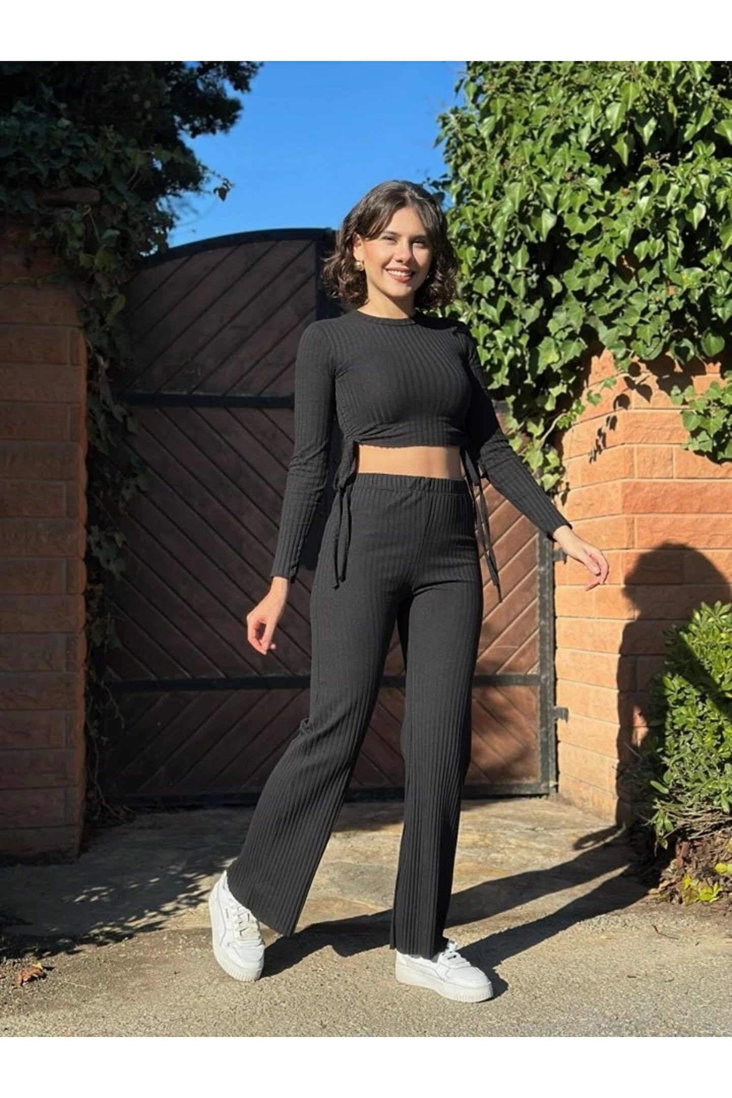 Kadın Yandan Bağlamalı Geniş Paçalı Fitil Kaşkorse İkili Takım