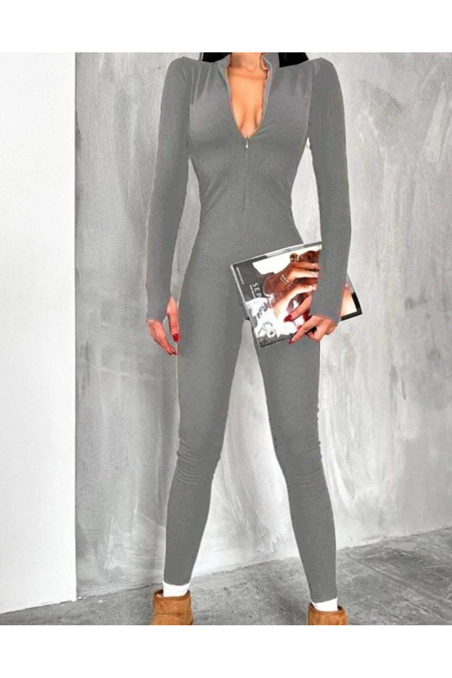 Modayakamoz MDB Kadın Uzun Kollu V Yaka Baş Parmak Geçirmeli Detay Kaşkorse Tulum