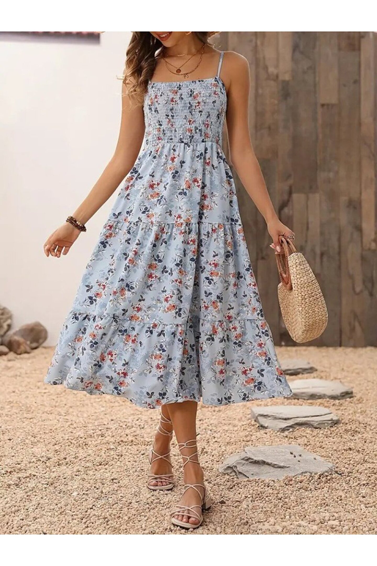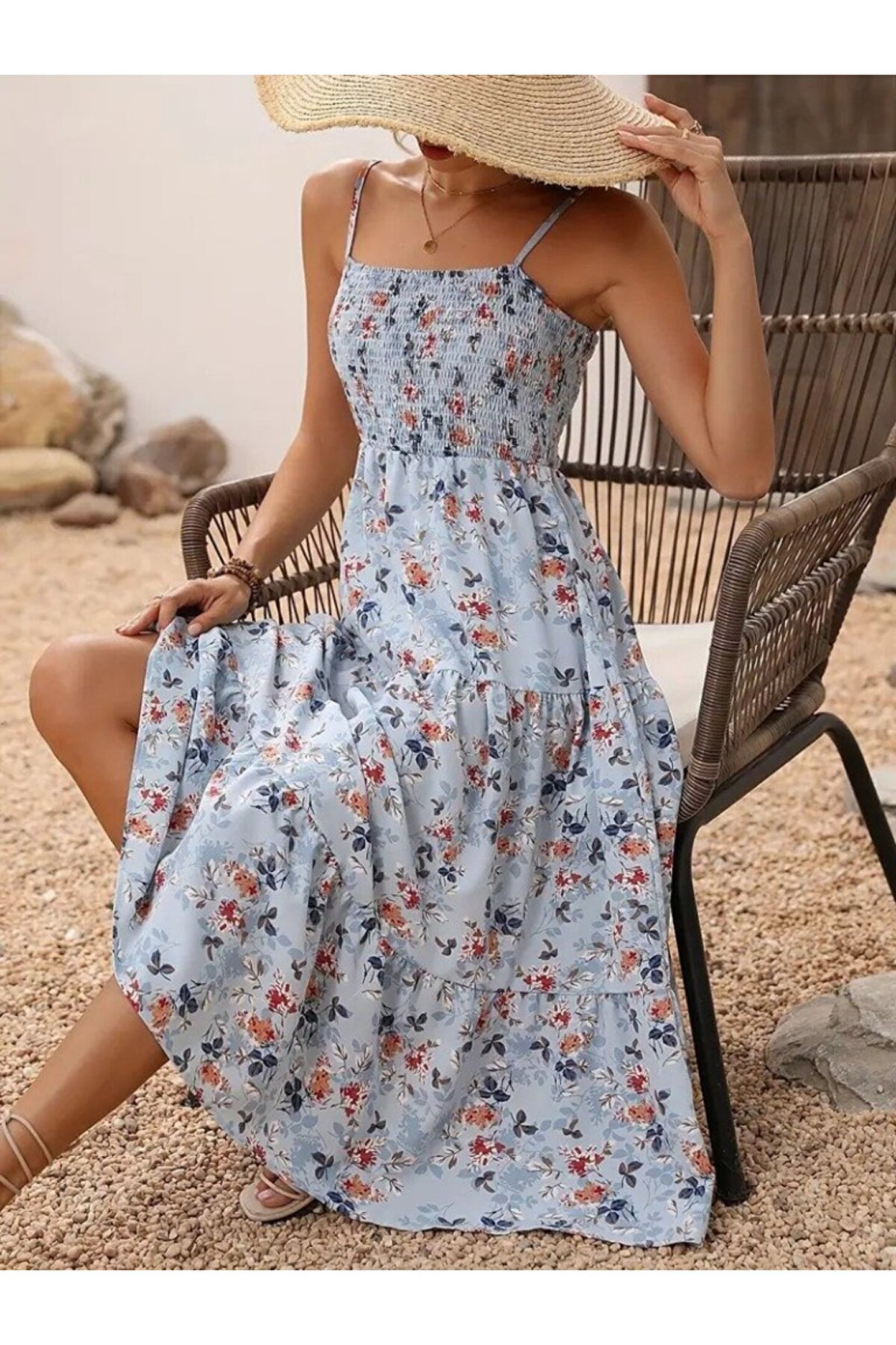 Moderie Butik Kadın Ip Askılı Geniş V Yakalı Desenli Uzun Süprem Elbise
