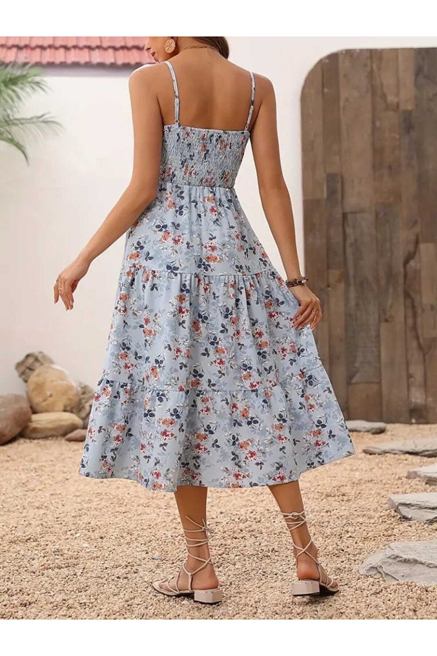 Moderie Butik Kadın Ip Askılı Geniş V Yakalı Desenli Uzun Süprem Elbise