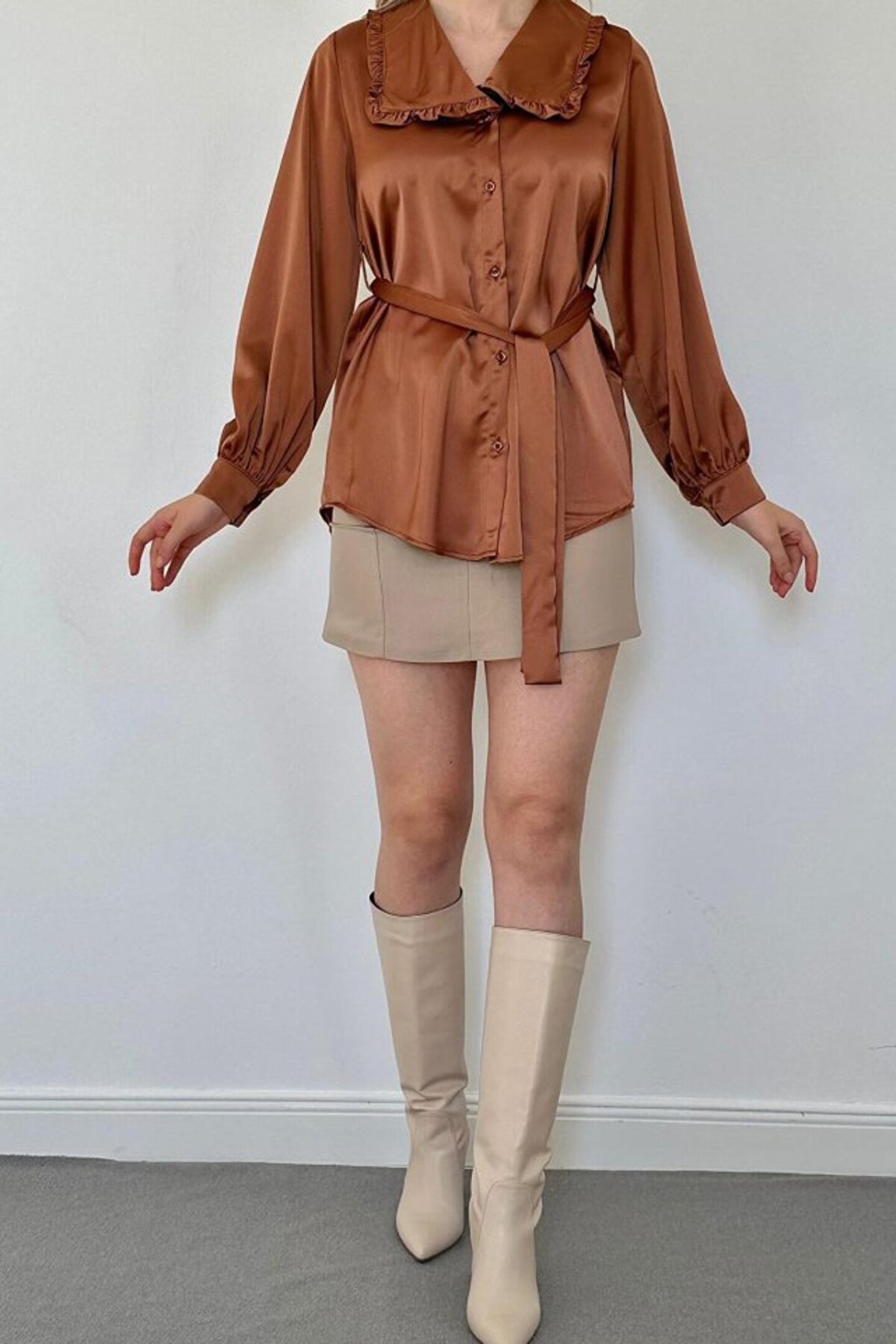 Kahverengi Yakası Fırfırlı Kuşaklı Saten Gömlek