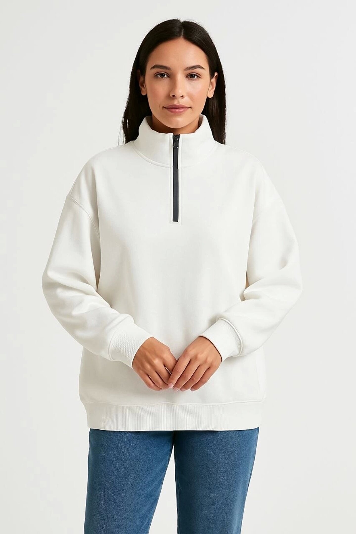 Monsi Tekstil Kadın Üç İplik Dık Yaka Yarım Fermuarlı SweatShirt - Beyaz